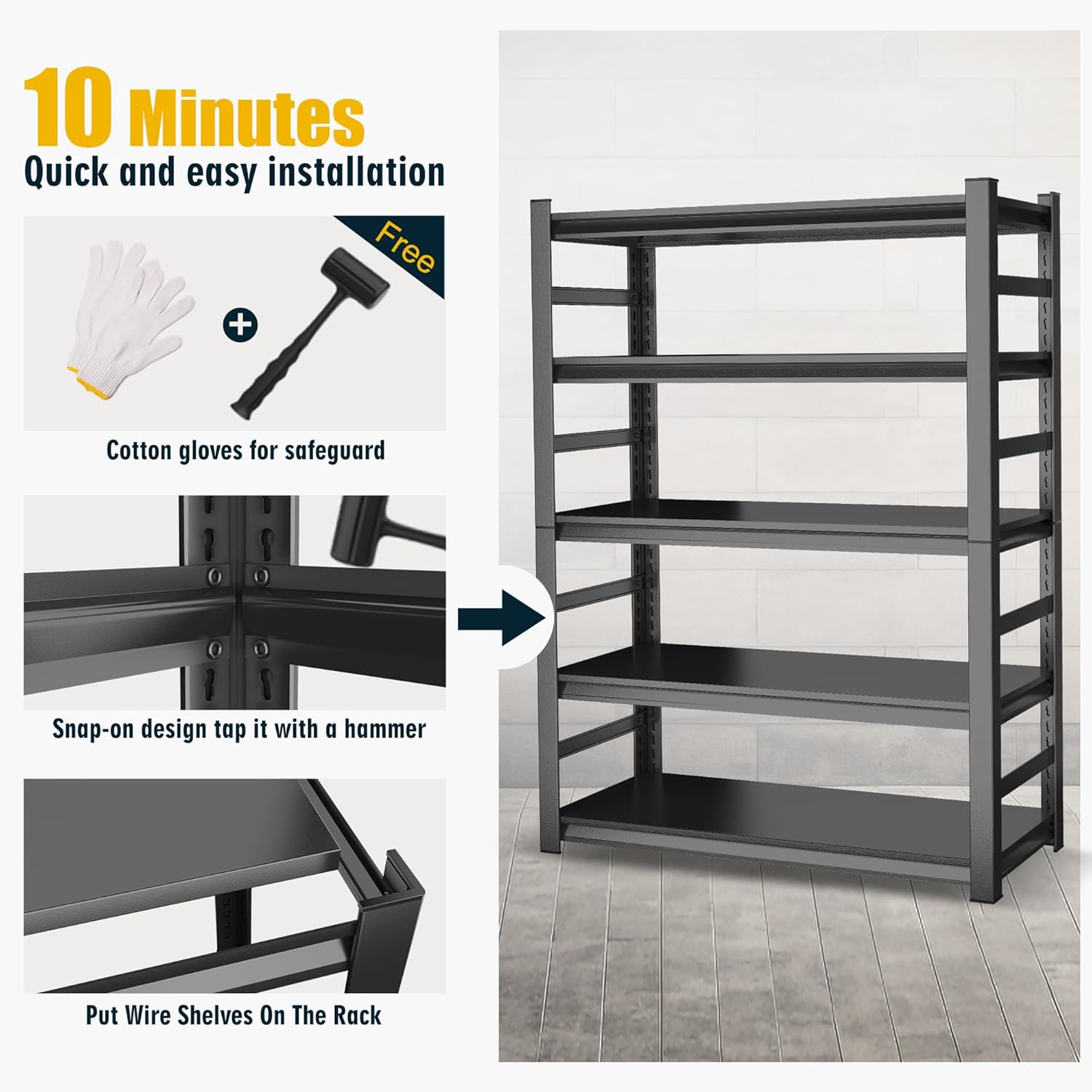 • 【Tool free,Simple & Quick Assembly 】 Our garage storage shelves are designed with bolt free interlocking, making it easy and fun to assemble them like building block toys.Comes with free rubber hammers and gloves, as well as detailed instructions and assembly videos, even children and the elderly can easily assemble within 10 minutes.