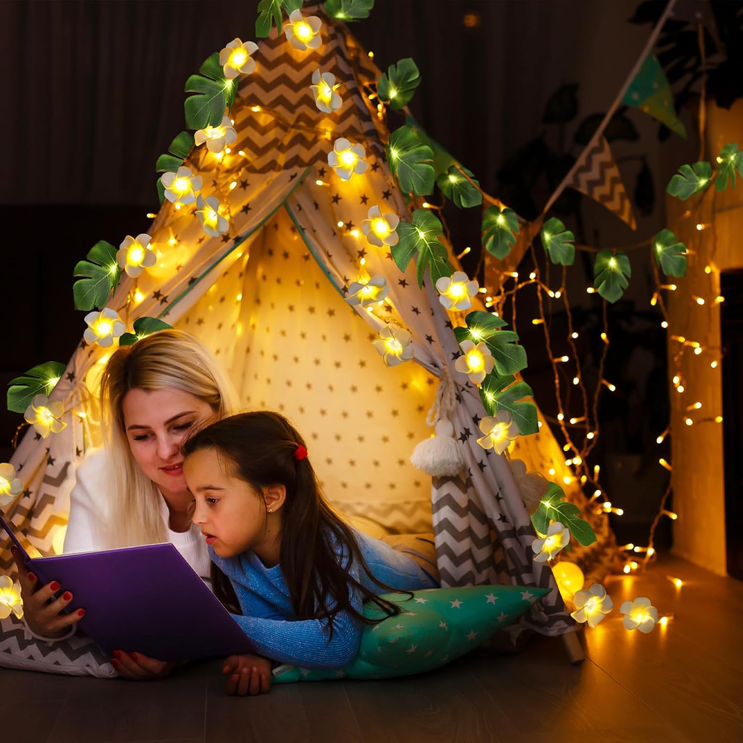 • Wide Application:Flower Monstera Fairy String Light suitable for Hawaiian tropical luau Jungle beach theme wedding party,easy to install on indoor stair banisters, mantel, bedroom walls, floors, ceilings and outdoor trees, lawn, and garden.