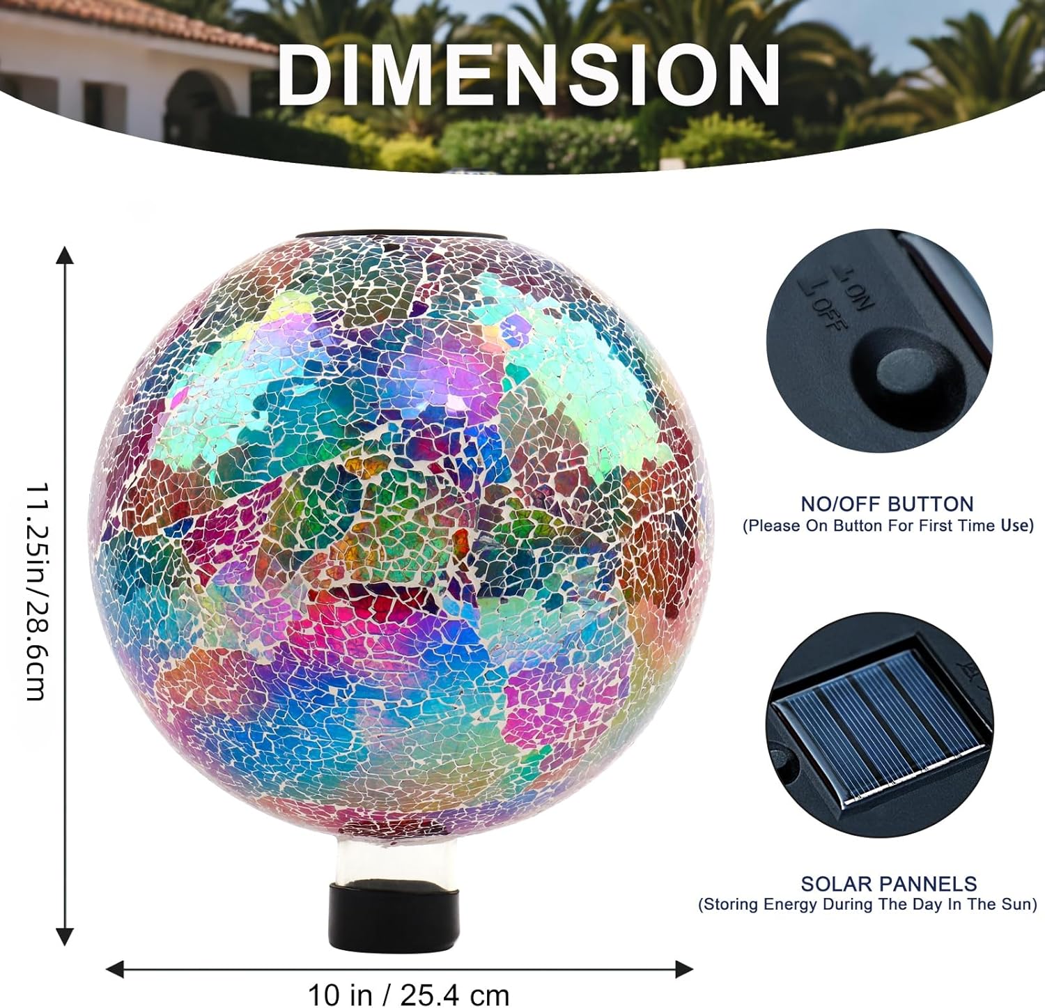 • COLORFUL MOSAIC PATTERNS & CRAFTSMANSHIP: Combined with blue, green, red, yellow, and purple glass pieces, this solar globe creates vibrant color contrasts through hand-arranged mosaic artistry. Each glass fragment is carefully placed to form a crackle-textured design, adding depth and a touch of handmade elegance. The mosaic’s intricate layers catch sunlight by day, radiating jewel-like brilliance that harmonizes with outdoor or indoor spaces