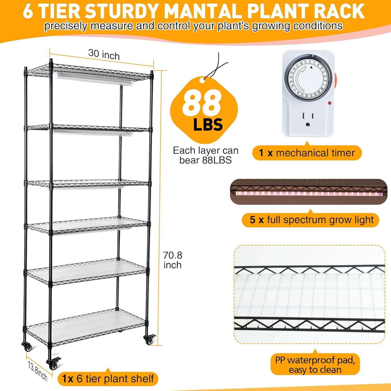 • Complete Indoor Greenhouse Kit: Package includes 1 x 6 tier plant rack, 1 x full spectrum grow light, 6 x PP waterproof pads; 1 x Mechanical timer; These accessories empower you to precisely measure and control your plant's growing conditions, ensuring optimal growth