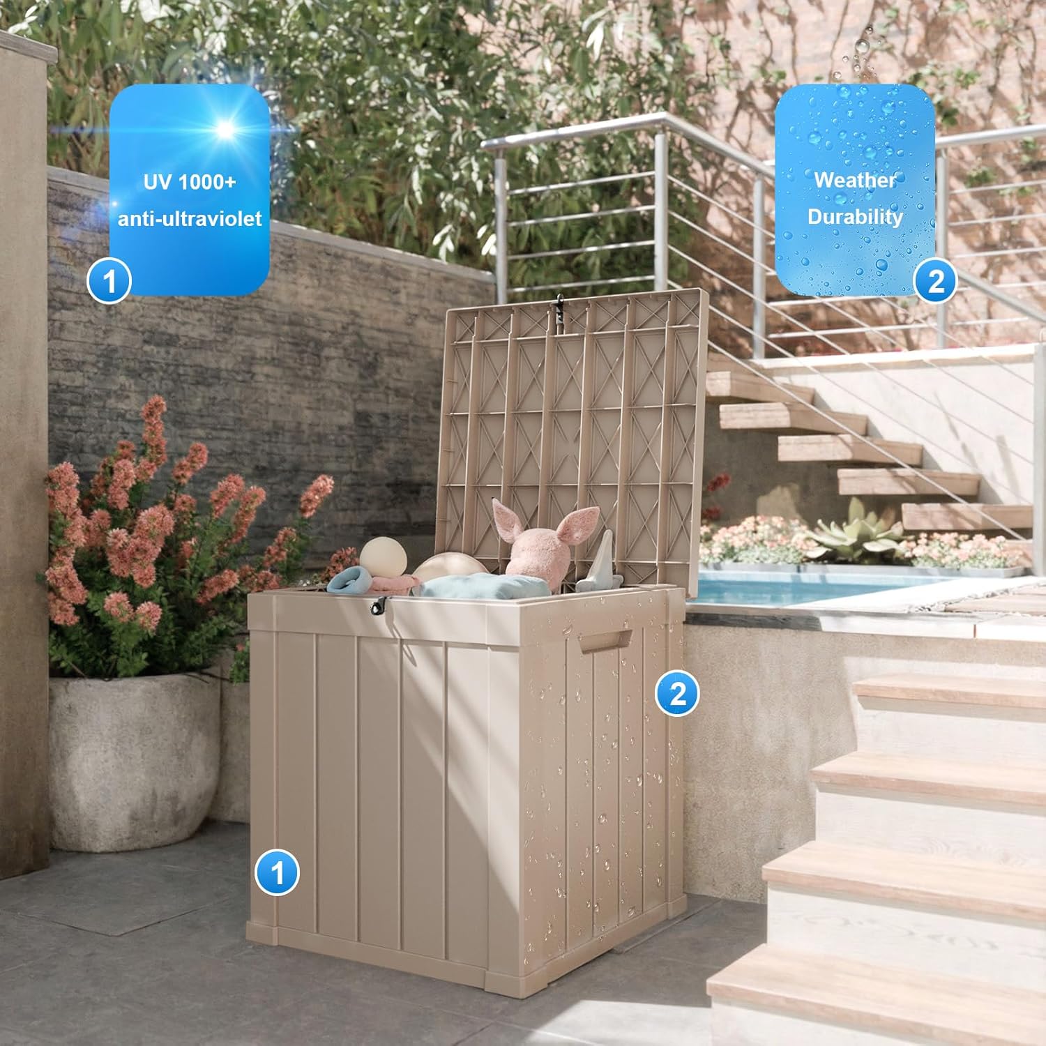• Durable and Sturdy:Built with strong plastic, this deck box is UV-resistant and won't fade or crack in the sun. It’s designed to withstand harsh outdoor conditions and provide long-lasting durability.