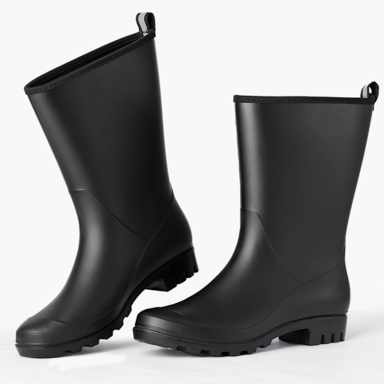 • Mid Calf Rain Boots for Women: Designed for wide calves, these matte-finished Wellington boots offer a perfect fit. If you have slim calves or narrow feet, consider sizing down for a snug fit. Made from premium PVC, these boots provide complete waterproof protection and exceptional flexibility for all-day comfort.