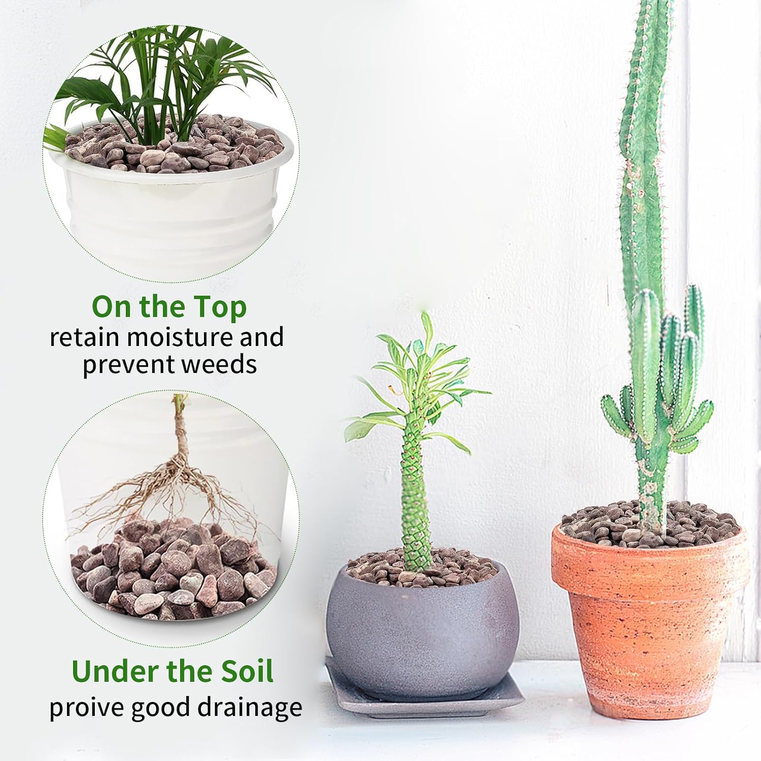 • 【Pebbles for Indoor Plants】Small pebbles can be used on top of plants to decorate succulents and to keep soil from flying everywhere when watering. Used at the bottom, they provide good drainage and prevent root rot and overwatering
