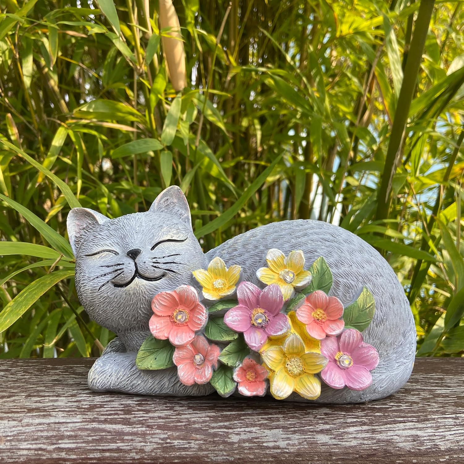 • Perfect Size: The solar cat light is handmade with vivid and cute facial expression, lifelike fur texture, and colorful flowers around the resting cat. The LED cat statue measures 7.5’’Lx3.74’’Wx4.5’’H, great embellishment for indoor home decor and outdoor garden and patio decor