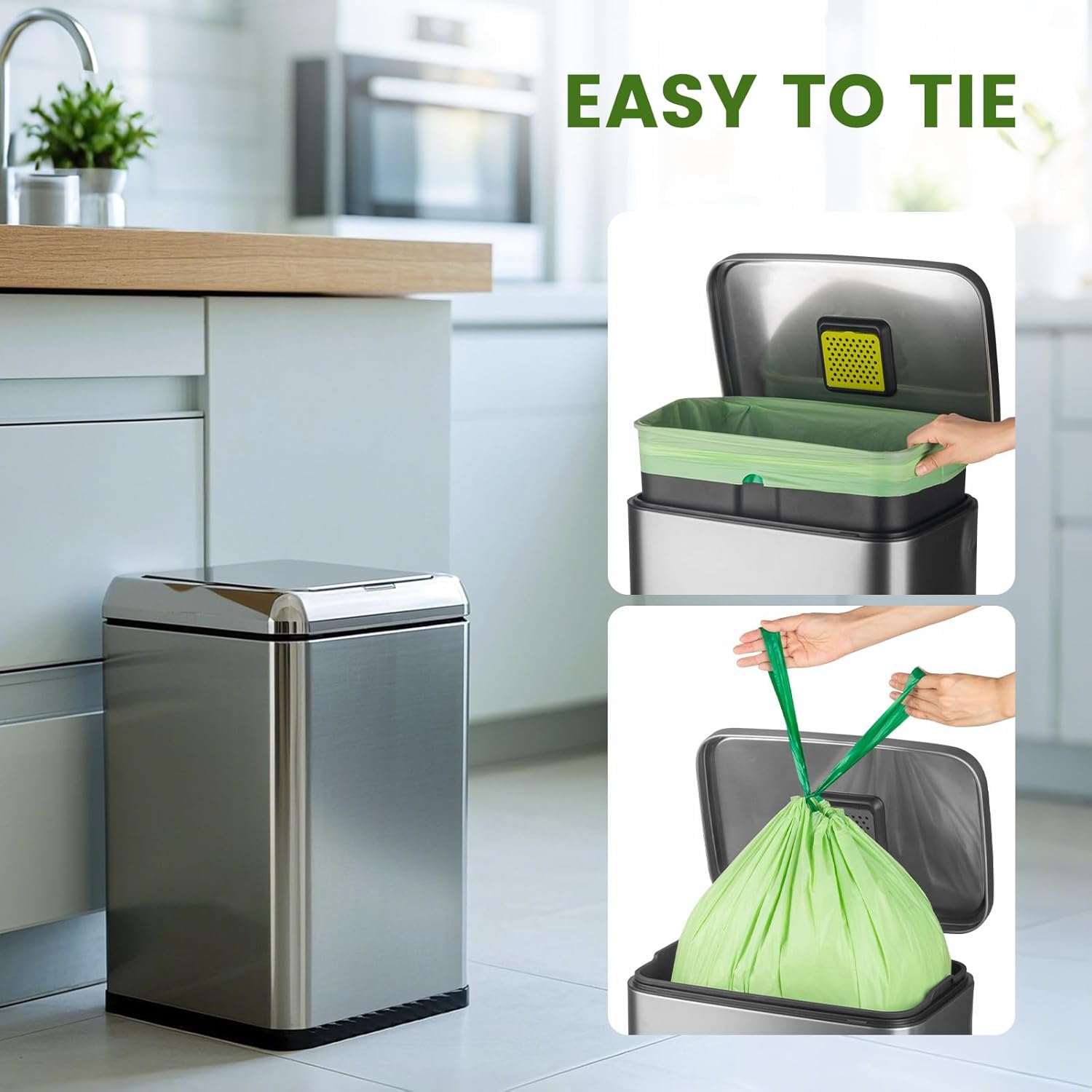 • Product Information: SUPERBIO Compostable Drawstring bags, 4 gallon (15.1L) 17.7 in x 19 in x 0.9 mil, 40 bags per roll, tear free design is convenient