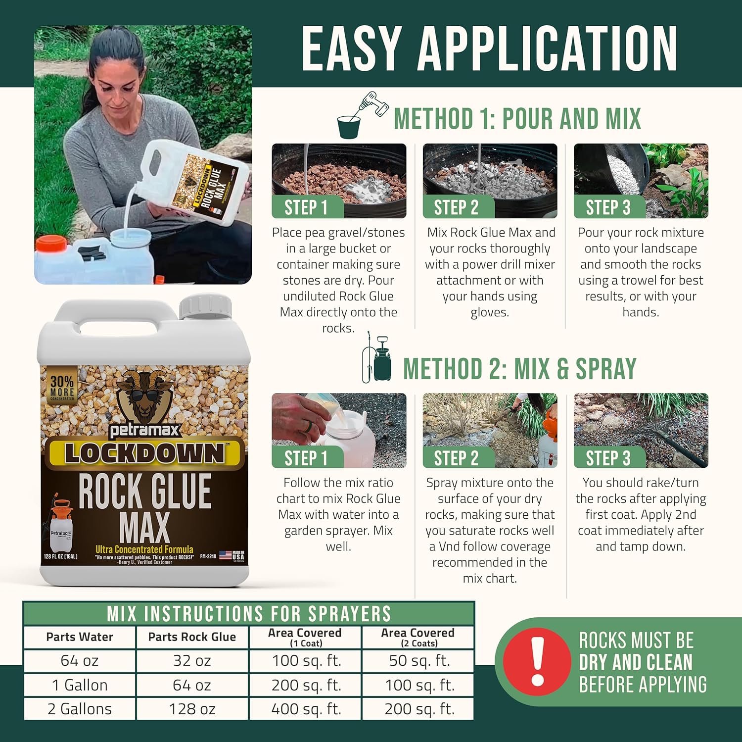 • PROFESSIONAL APPLICATION: Achieve a neat and beautiful landscape at home using our rock glue for landscape, pea gravel stabilizer, gravel and mulch stabilizer. It's ideal for use around trees, pathways, driveways, planting beds, borders, and slopes. This is a concentrated formula that works great with dilusion or can applied as is for extra strong hold.