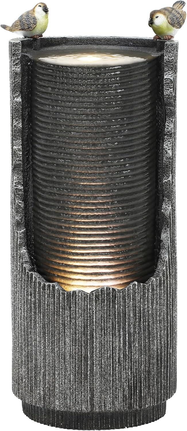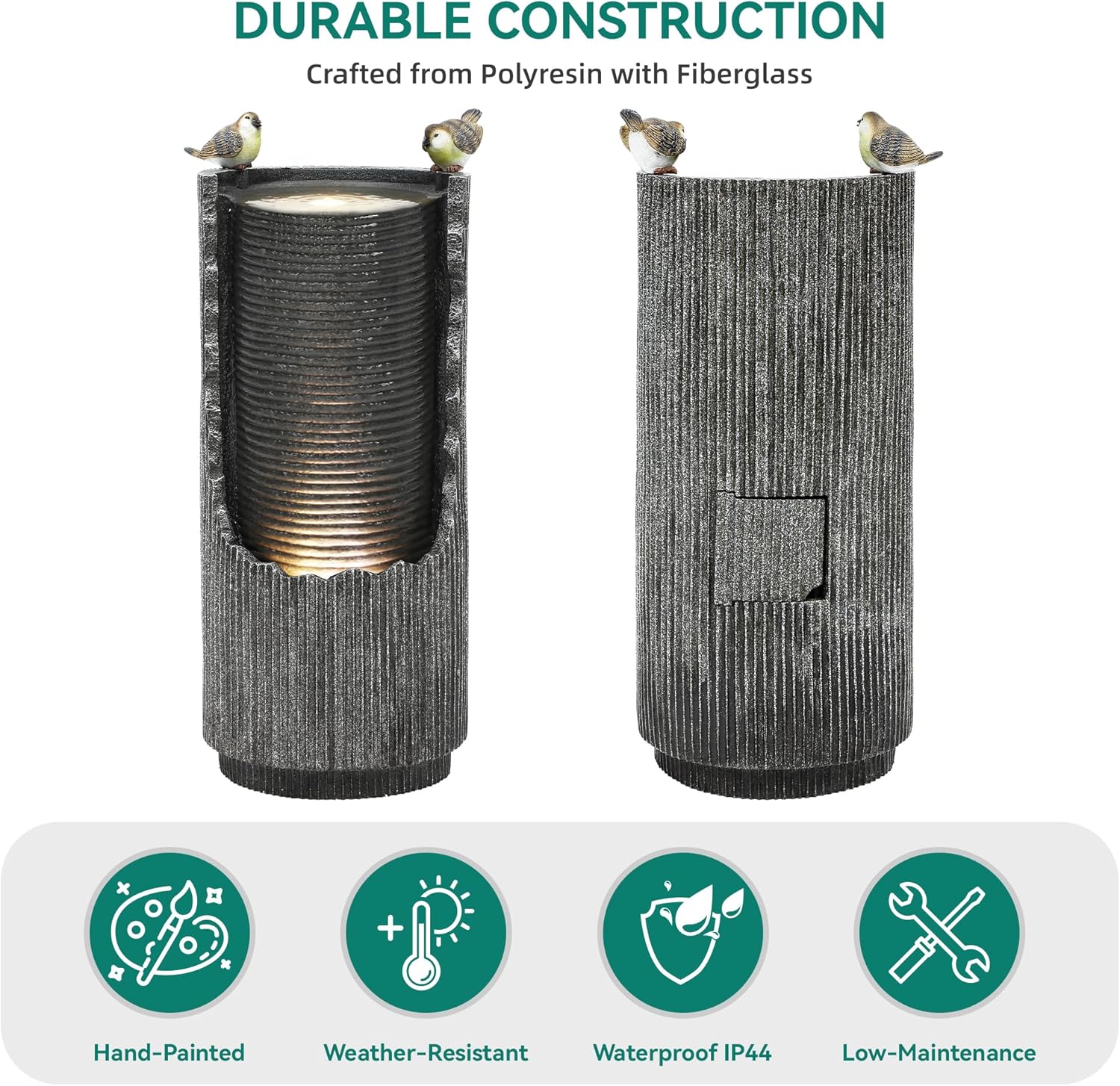 • RUSTIC JAR OUTDOOR FOUNTAIN: Our Modern Column Outdoor Fountain features a one-of-a-kind design. It combines handcrafted 3D concrete textures, rustic details, and charming bird accents. Measuring 14.96"L X 12.8"W X 31.89"H, this Outdoor Resin Fountain seamlessly blends modern aesthetics with natural charm, making it a perfect addition to any outdoor space.