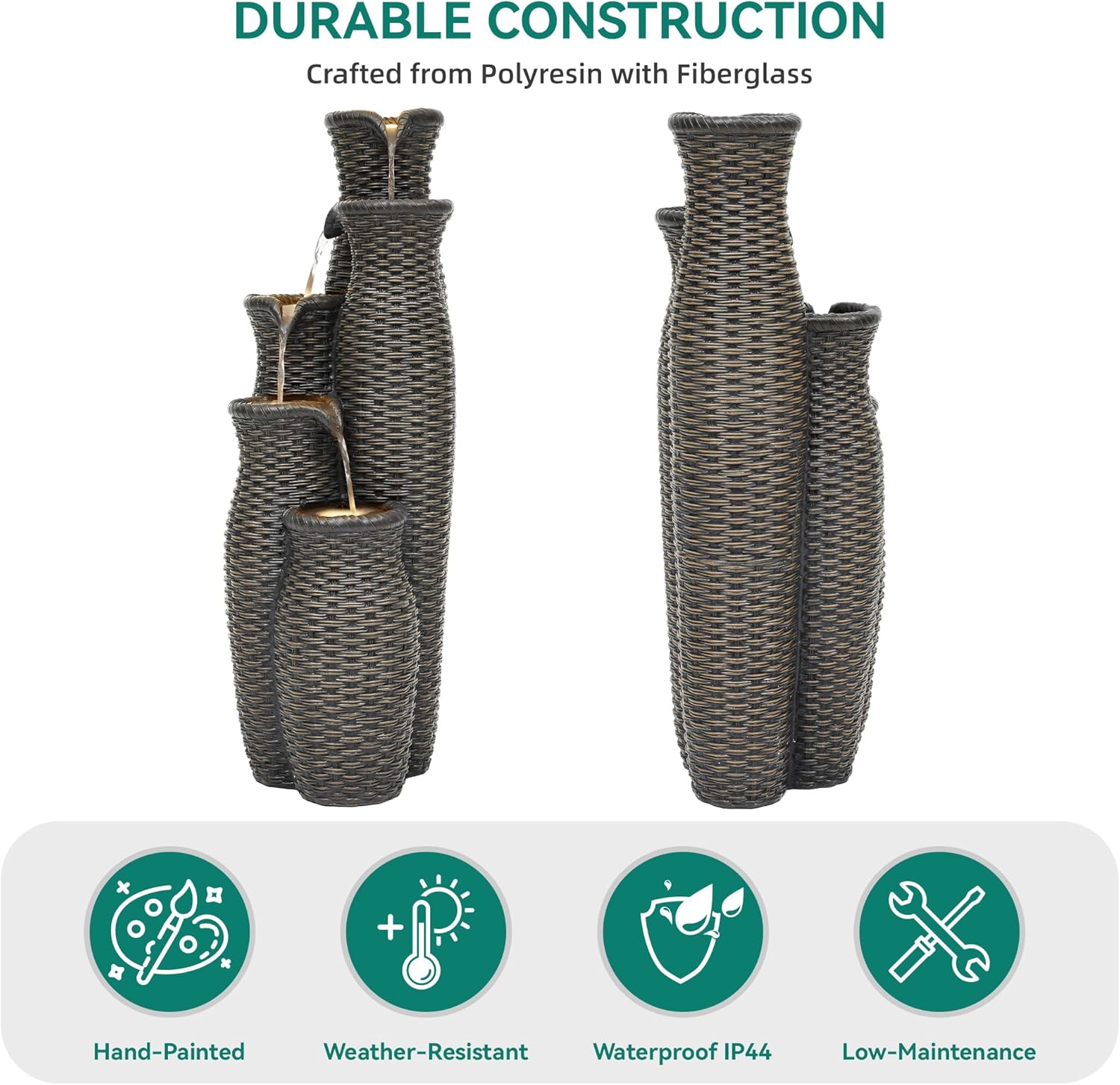 • UNIQUE WOVEN-INSPIRED DESIGN: Our elegant tall 5-tier vase outdoor fountain, sized at 14.76"L X 12.01"W X 32.87"H, boasting a one-of-a-kind 3D faux rattan texture. This outdoor resin fountain combines modern aesthetics with natural charm. It's not just a fountain; it's a statement piece that will instantly elevate the aesthetics of your garden, patio, or backyard.