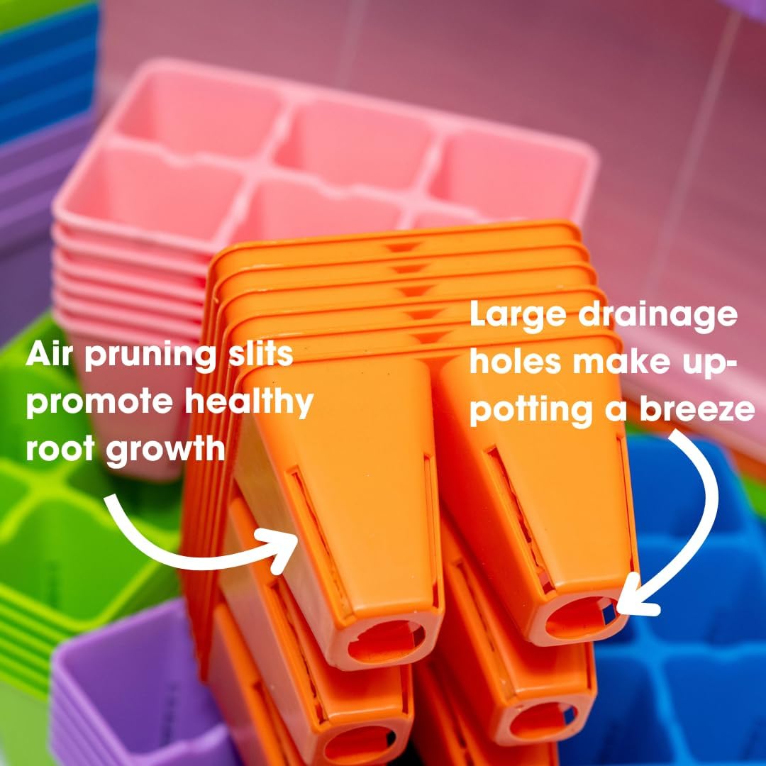 • Complete seed starting kit: 60 professional cell plug inserts, 5 heavy-duty trays, 90 transplant pots, and 5 humidity domes - everything needed to grow your entire garden from seed to transplant