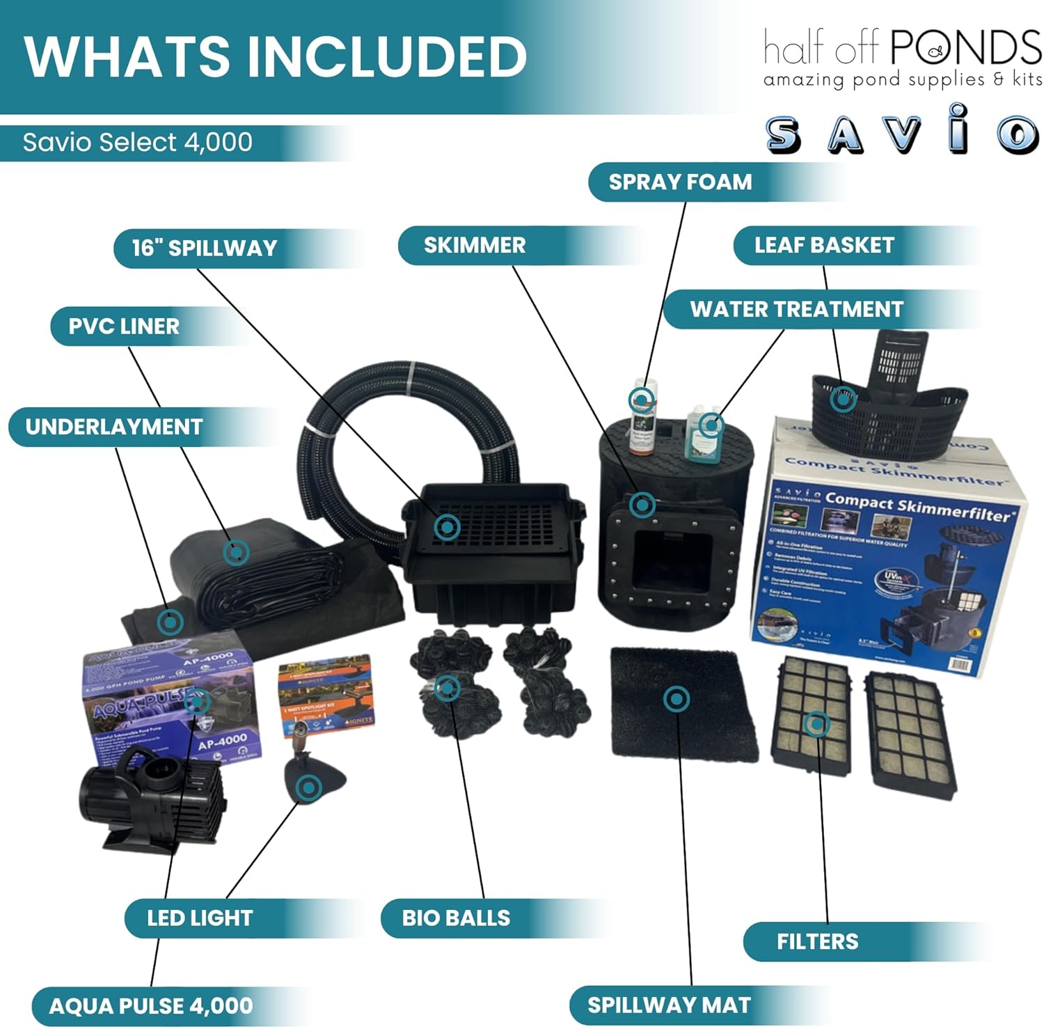 HALF OFF PONDS Savio Select 4,000 GPH Submersible Pump Pond Kit with 15' x 15' PVC Plastic Pond Liner for Water Garden & Koi Pond