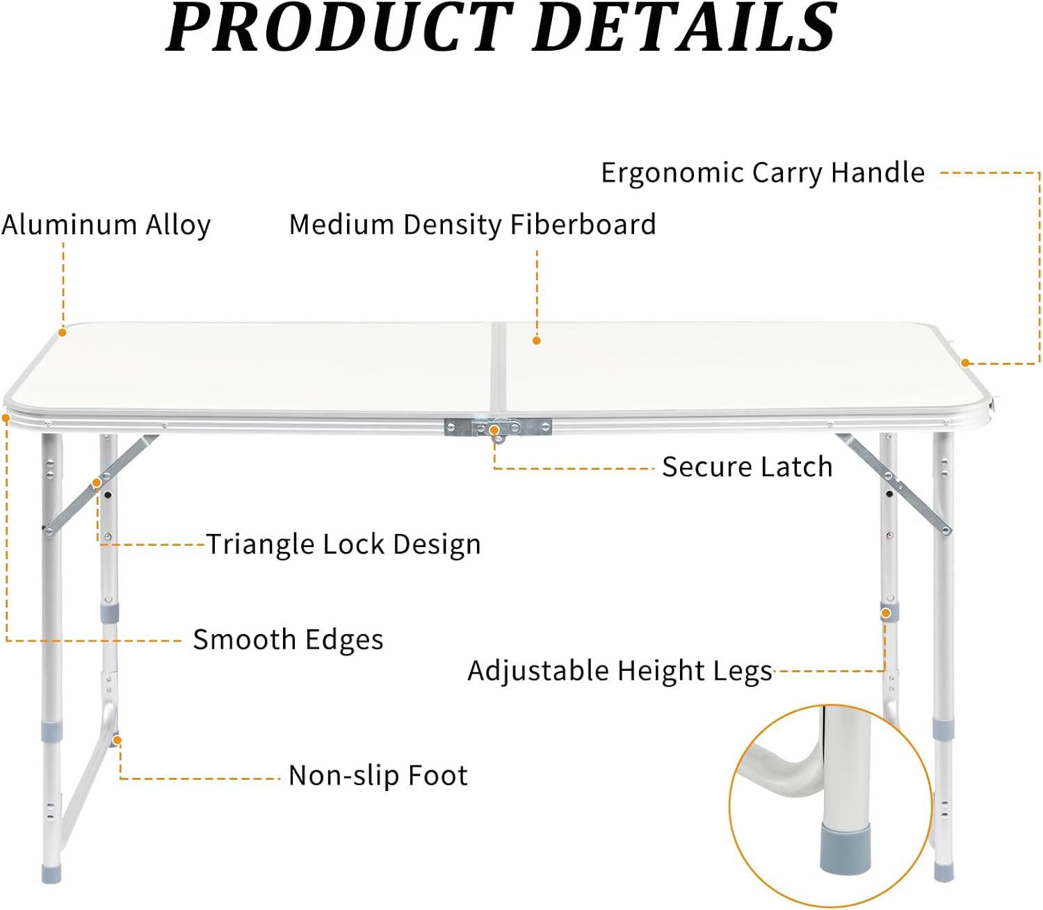 • 【Buckle Design & Triangle Lock Design】The folding table has a aluminum alloy frame and a wear-resistant desktop. The buckle design in the middle of the folding table and the triangular lock design of four table feet can ensure that the table legs and desktop are firmly locked when unfolded, and also can prevent any shaking or tilting during use. When stored, the buckle on both sides is locked, in order to make your travel more eariser