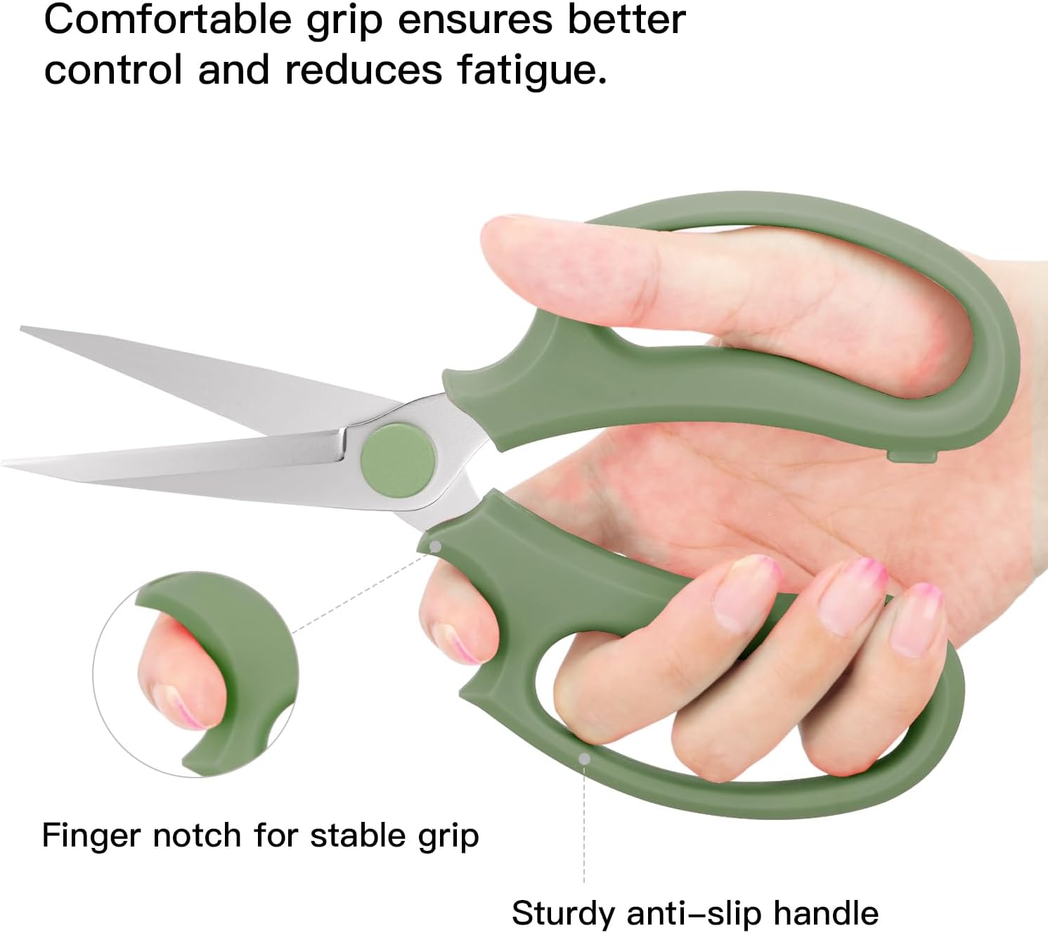 • ERGONOMIC HANDLE: The handle adopted non-slip PP material, durable yet soft; The ergonomic handle with groove design, which is portable and lightweight, let you comfortable to grip; The delicate appearance will the shear looks rather functional and stylish.