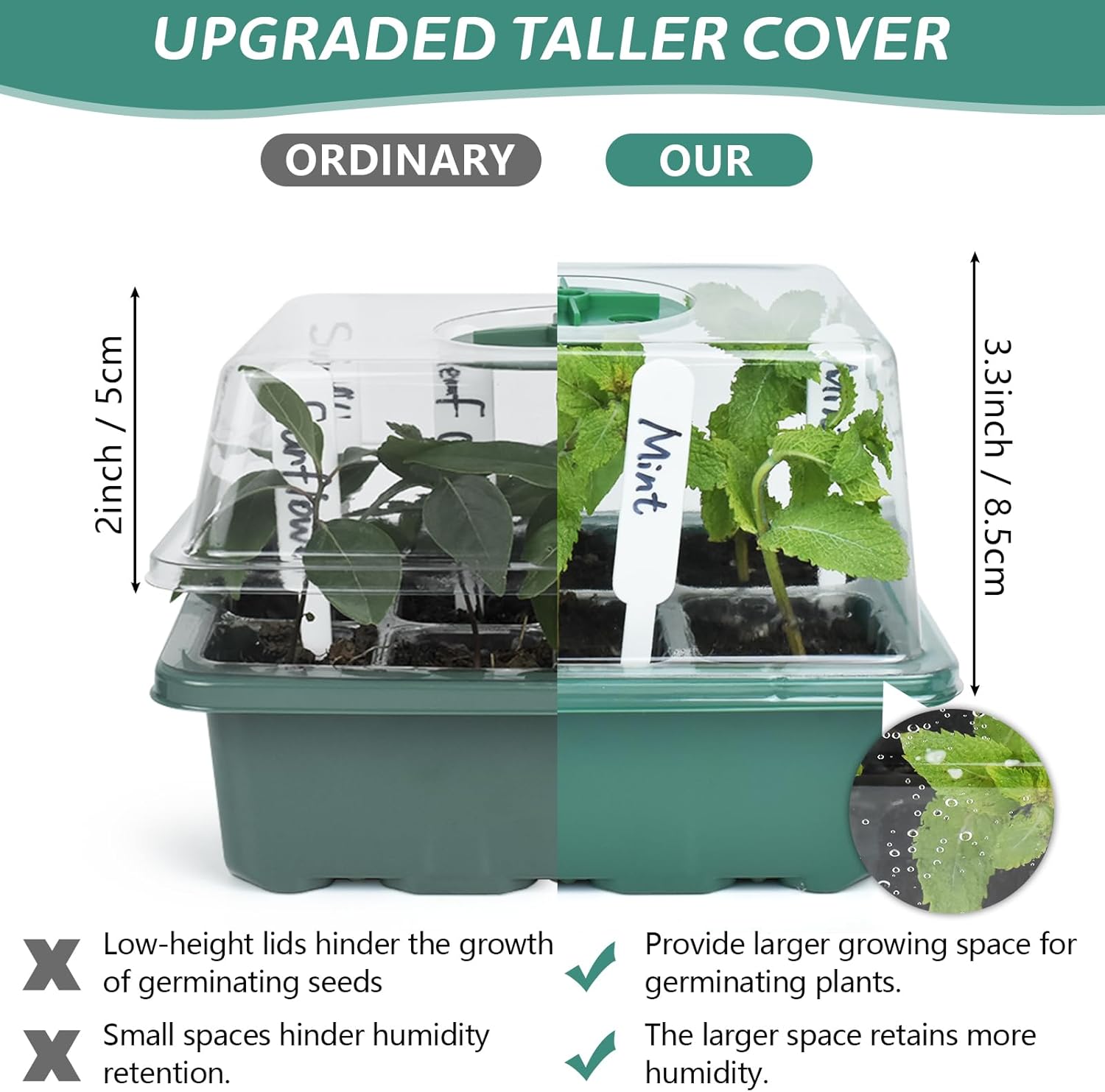 • Upgraded Taller Cover: The 8.5cm (3.3 inches) cover provides extra space for growing plants, better retaining humidity compared to standard 5cm (2 inches), promoting optimal seed germination and growth.