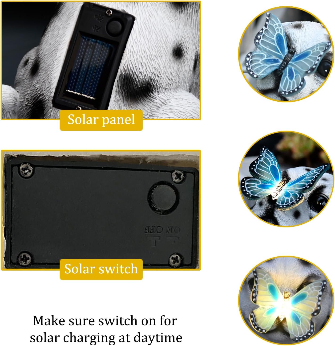 • ▶ Convenience - Dog solar light design will automatically charge and store energy during the daytime, only light up at night or in the dark automatically. You just push the OFF switch to ON for automatic activation at sundown.