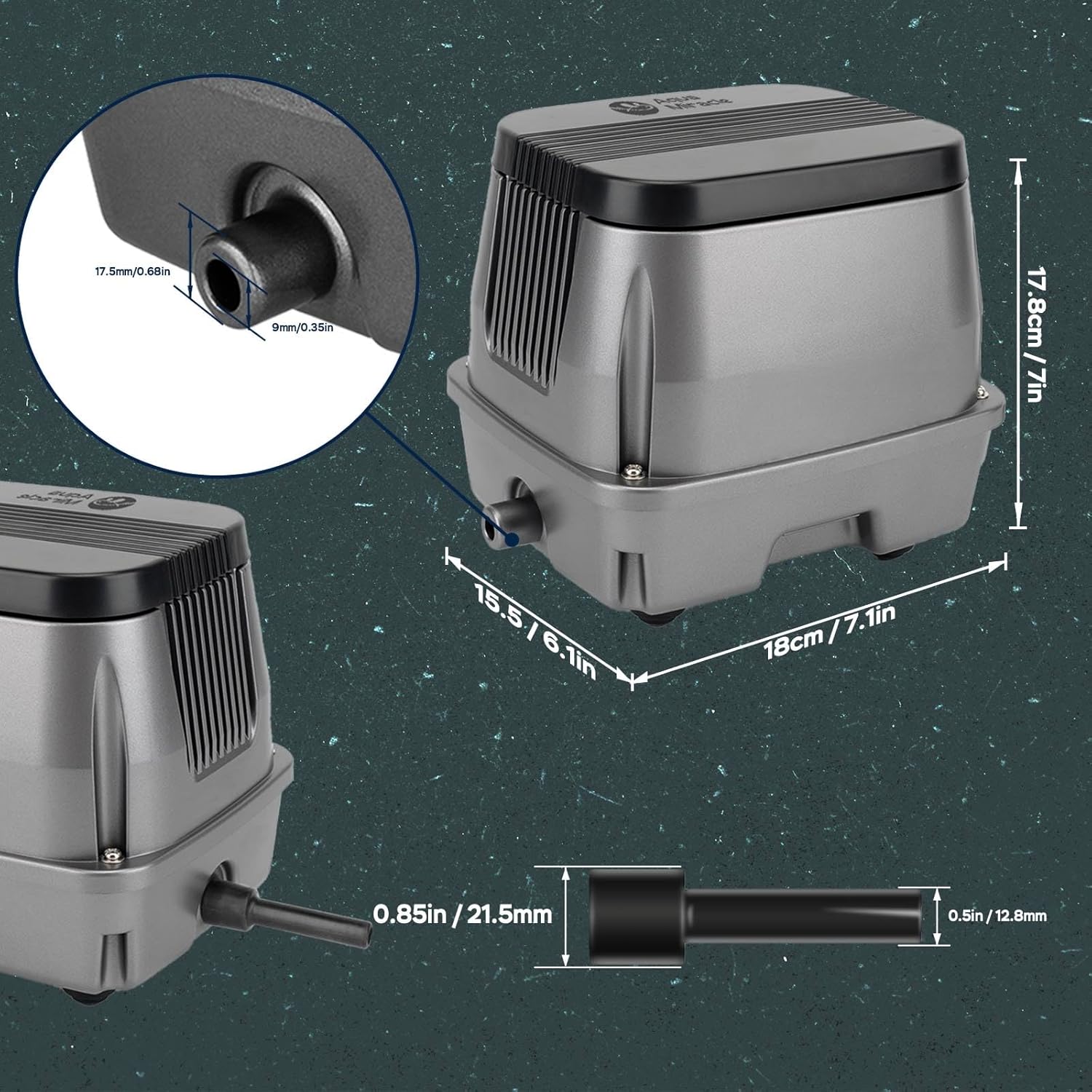 • ENERGY EFFICIENT - Designed to optimize oxygenation in your ponds, this pond air pump operates at 25 Watts, with a flow rate of 2.12CFM (950GPH) and an air pressure of 4.35PSI (0.03MPa). Ideal for ponds or water gardens ranging from 10,000 to 15,000 Gallons, the air flow can be easily adjusted using the air regulator, allowing for customized aeration.