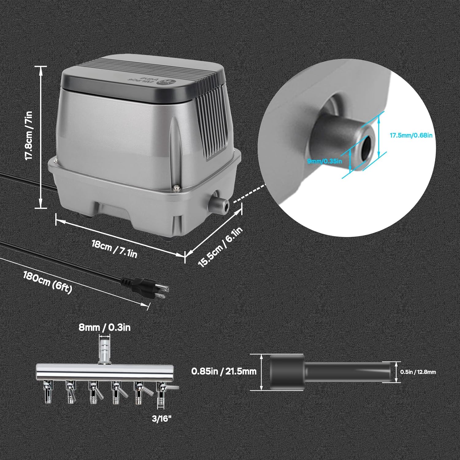 • PACKAGE - The pond air pump comes with a heavy-duty chrome-coated air diffuser (6 outlets with air volume regulators) to connect to air stones. Note: Airline tubing and air stones should be purchased separately.