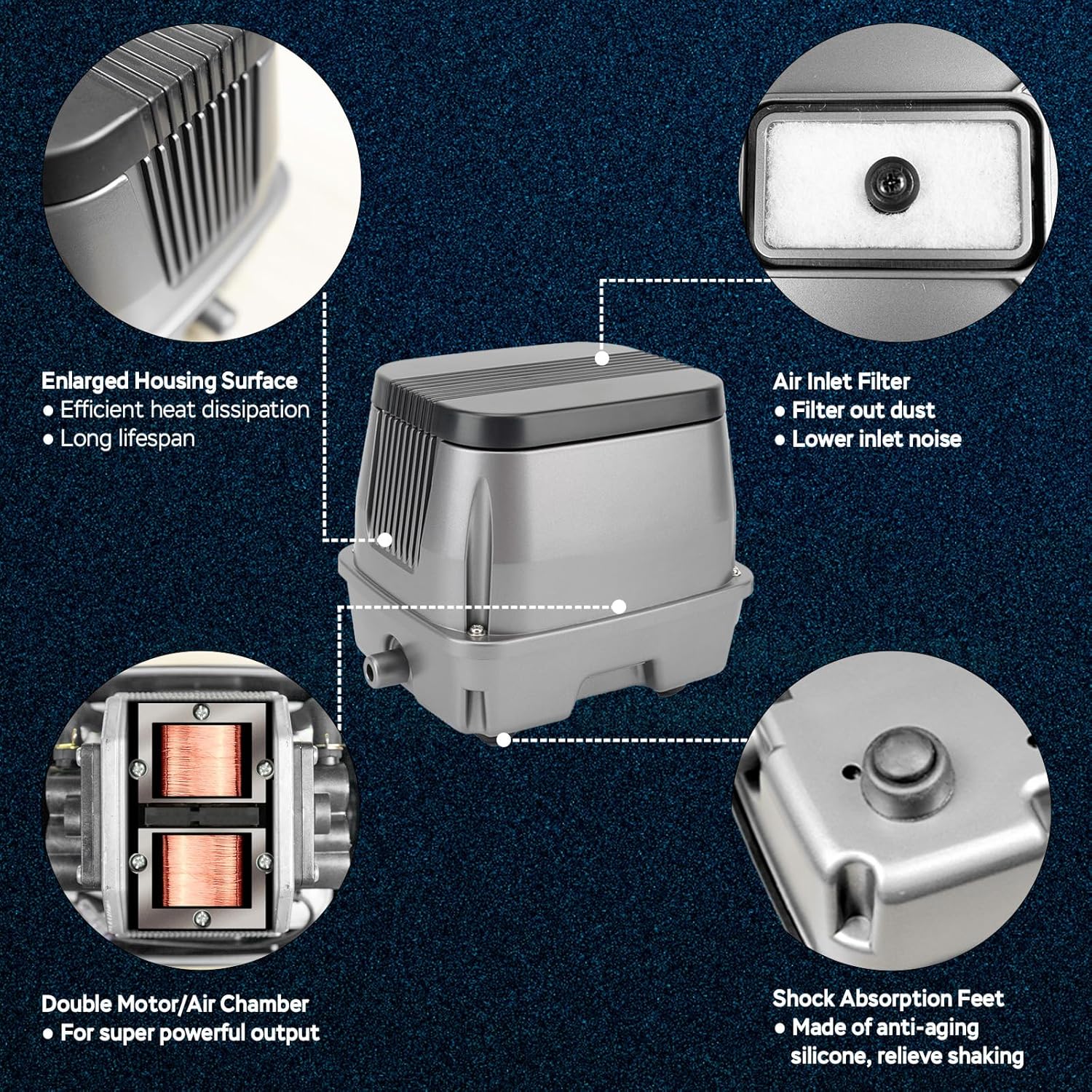 • SPECIFICATION - This linear air pump delivers a max of 635GPH powerful airflow at 0.03MPa pressure with an 18W energy-efficient copper coil motor that runs in stable operation and lasts longer. Perfect as a pond aerator, septic aerator, hydroponic air pump, or aquarium air pump, it provides high efficiency, low heat and low power consumption.