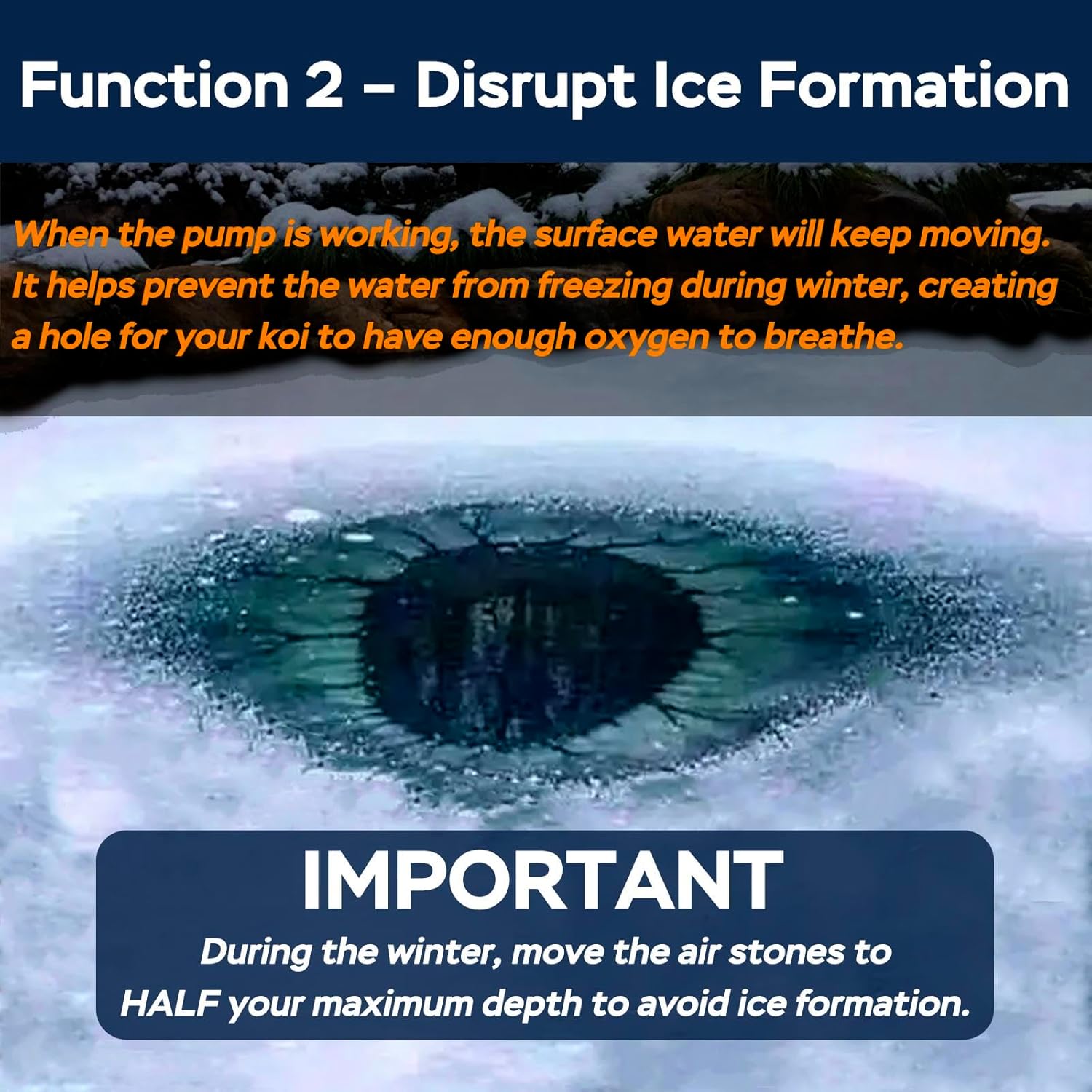 • DUAL-FUNCTIONAL - This versatile pond air pump serves a dual purpose. Not only does it work as a pond aerator, but it also helps prevent ice formation in the cold winter months. By creating a ventilation hole, it allows your koi to breathe and ensures their well-being even in colder temperatures.