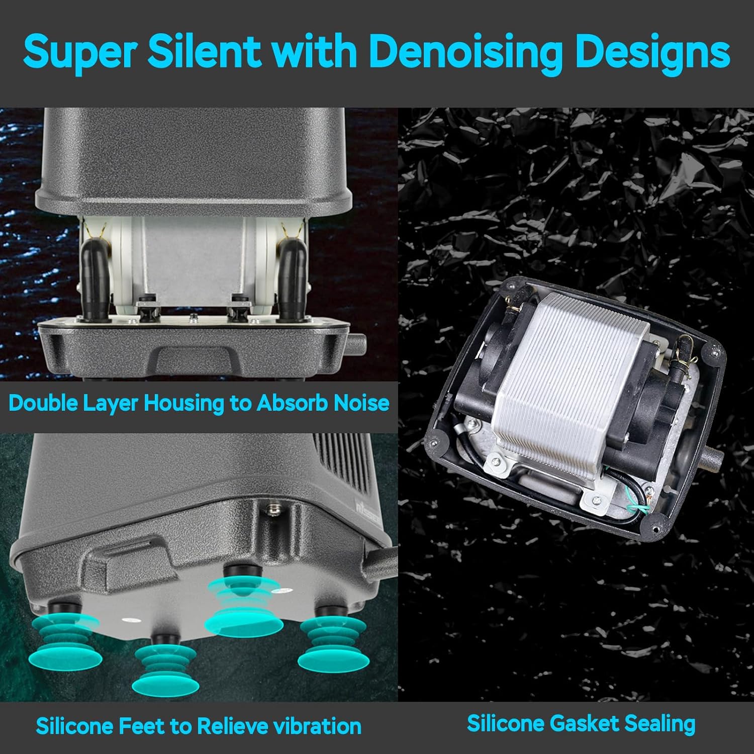 • SPECIFICATION - This linear air pump delivers a max of 1600GPH powerful airflow at 0.035MPa pressure with an 60W energy-efficient copper coil motor that runs in stable operation and lasts longer. Perfect as a pond aerator, septic aerator, hydroponic air pump, or aquarium air pump, it provides high efficiency, low heat and low power consumption.