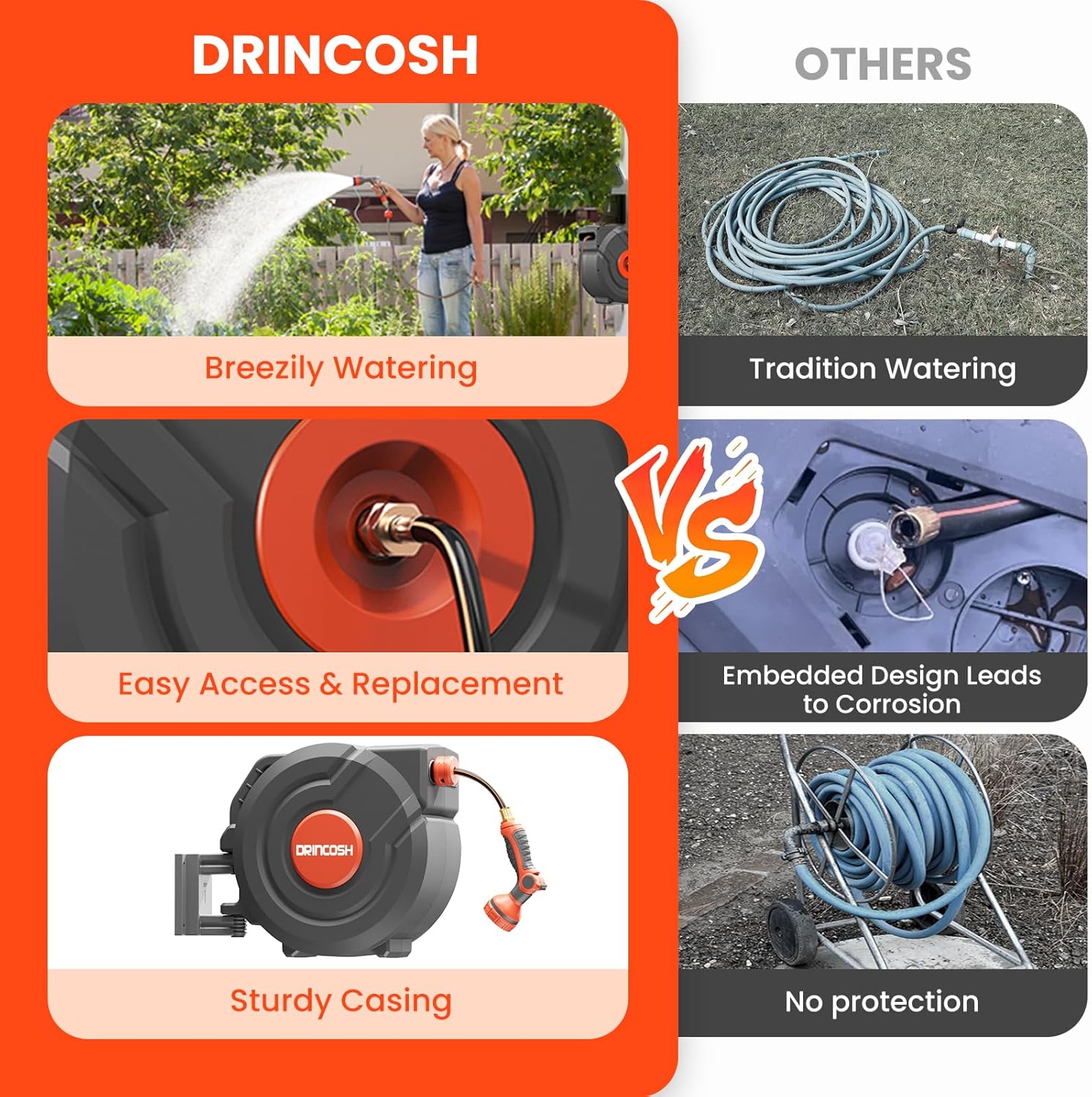 • 【Upgraded Auto-Retract & Adjustable Length Lock 】DRINCOSH garden hose reel is designed with advanced slow rewind technology, ensuring a smooth and tangle-free retraction every time. Simply give the hose a gentle pull, and it will retract safely at a controlled speed. The enhanced locking mechanism allows you to secure the hose at any desired length