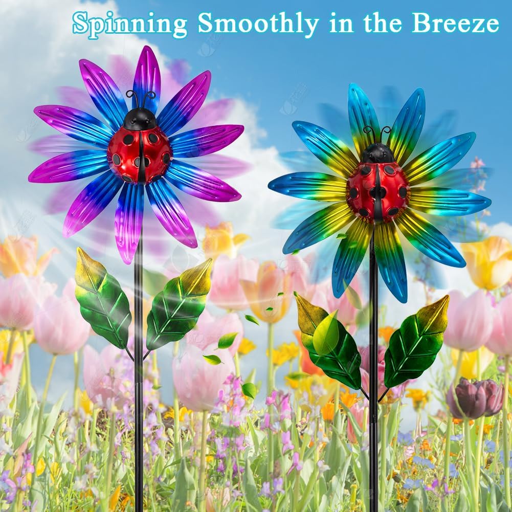2 Pack Wind Spinner Outdoor,Waterproof Metal Windmill with Ladybug,Pinwheels for Yard and Garden, Flower Wind Sculpture & Spinner for Patio Lawn Decor
