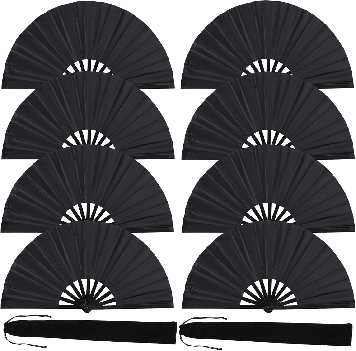 8 Pack Large Folding Hand Fans for Women/Men, Kungfu Taichi Rave Folding Fan with Bag, Large Popping Clacking Fans for Line Dancing, Concert, Party, Festival, Home Decorations(Black)