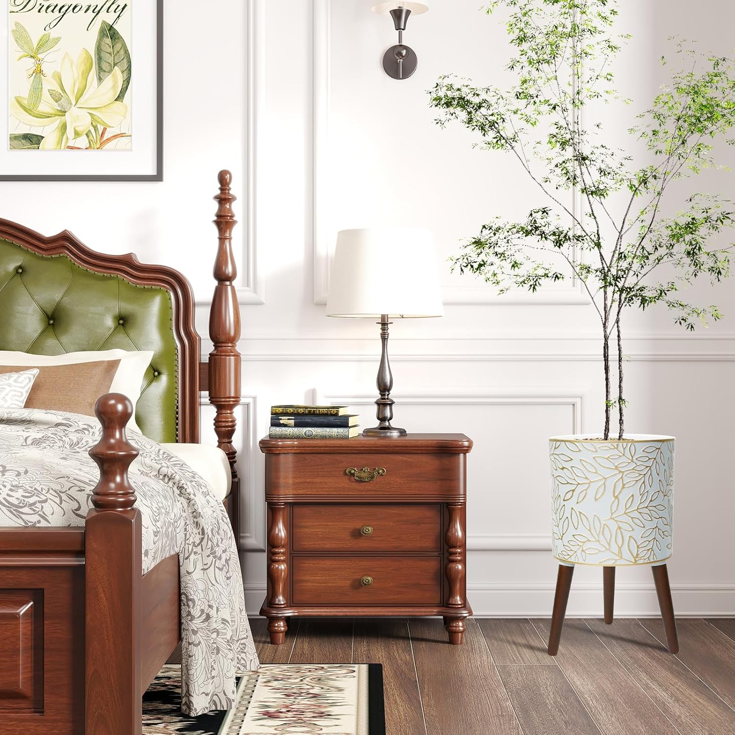 12inch Plant Pots with Wood Planter Holder Indoor Flower Pot with Gold Floral Embossed Modern Planters with Drainage Holes for Living Room, Office, Garden or Balcony