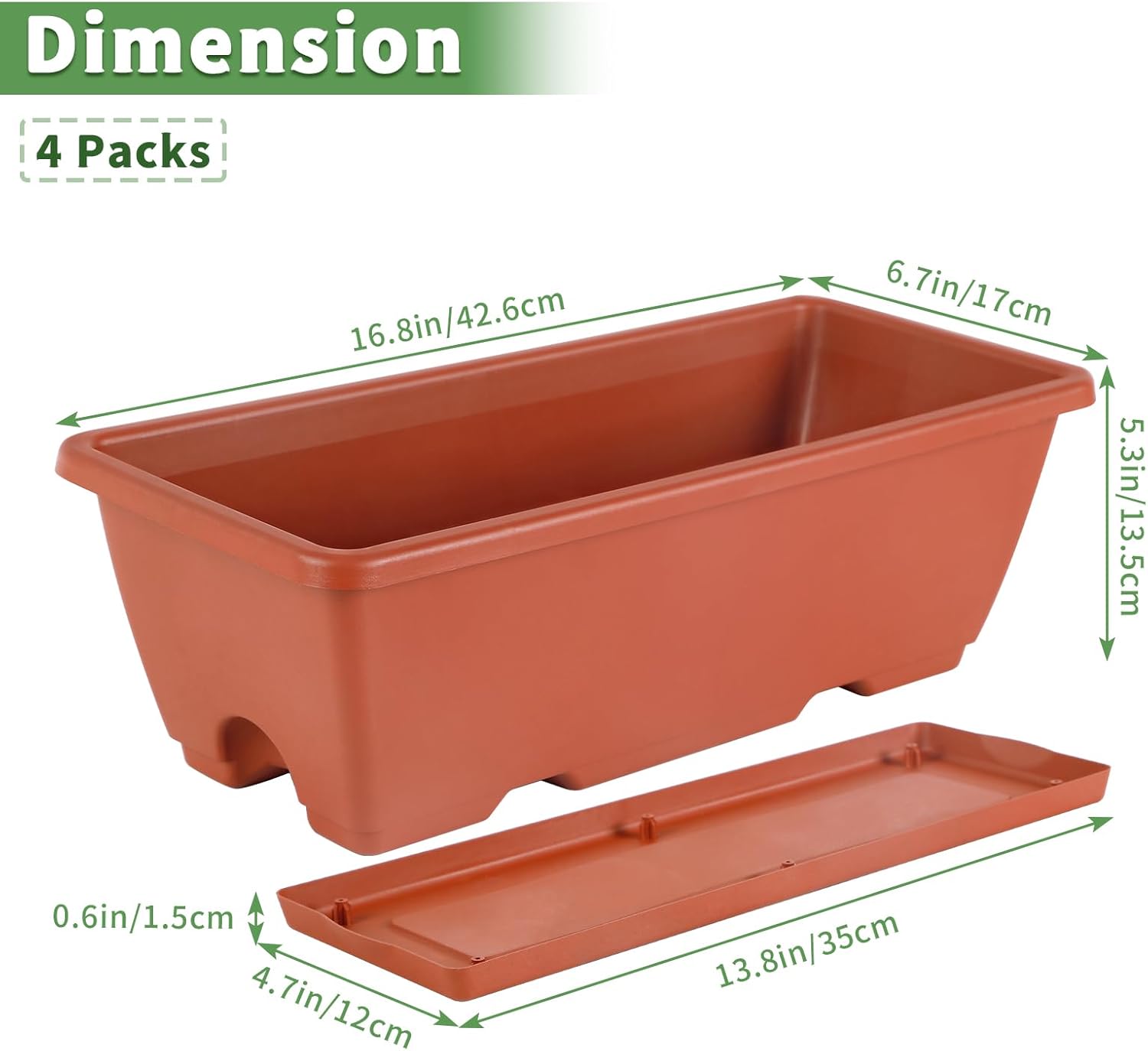 • Size of Railing Planter: The set includes 4 flower boxes and 4 suspension brackets. Each deck railing planter measures 16.9×6.9×5.5 inches, with a wide opening and narrow base, and the bottom measures 13.4 x 4.1 inches.Providing plenty of room to grow a variety of plants, from flowers to herbs and vegetables.