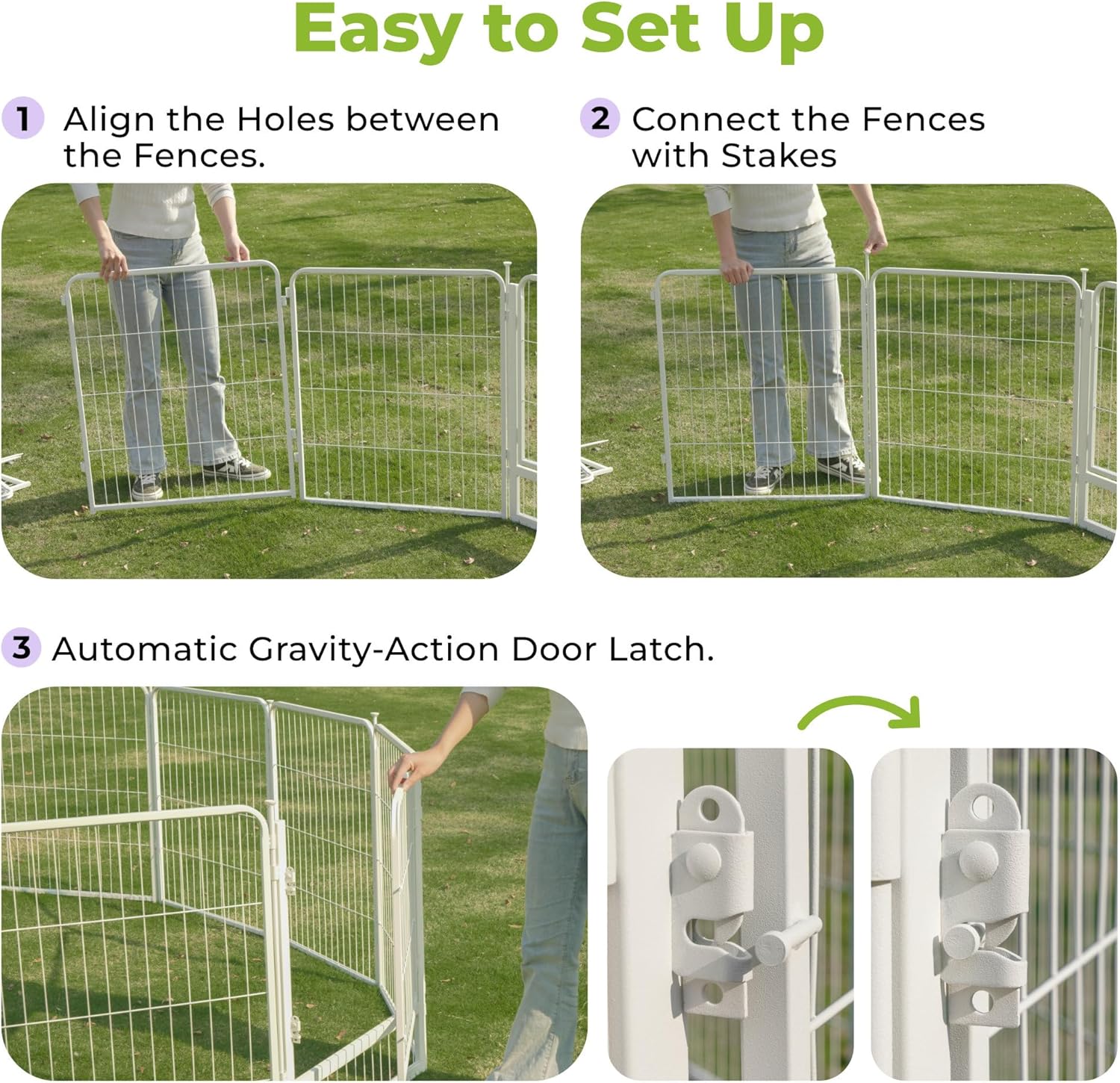 • Easy to Assemble: Say goodbye to complicated assembly! Garden fence with gate could be assembled in just a few minutes without tools, you only need to put the two fence panels facing out and align the rings, and finally insert the pole into the ring to fix it. The pole easily inserts into the soil, providing great stability