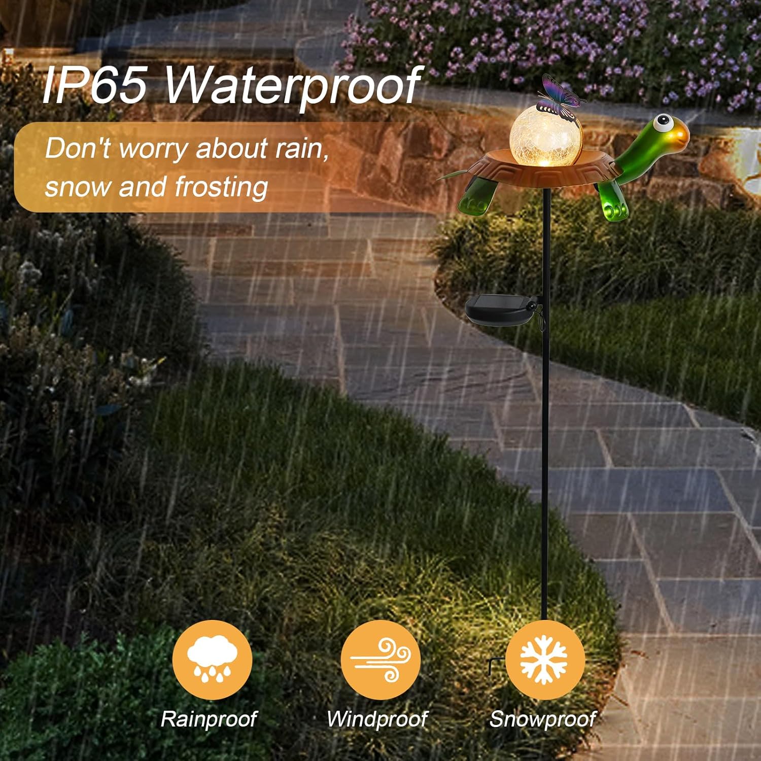 • Solar lights outdoor decorative are made from high-quality, durable metal & glass, the intricate cracked glass orb on turtle's back create a delicate yet eye-catching aesthetic, perfect for gardens decor