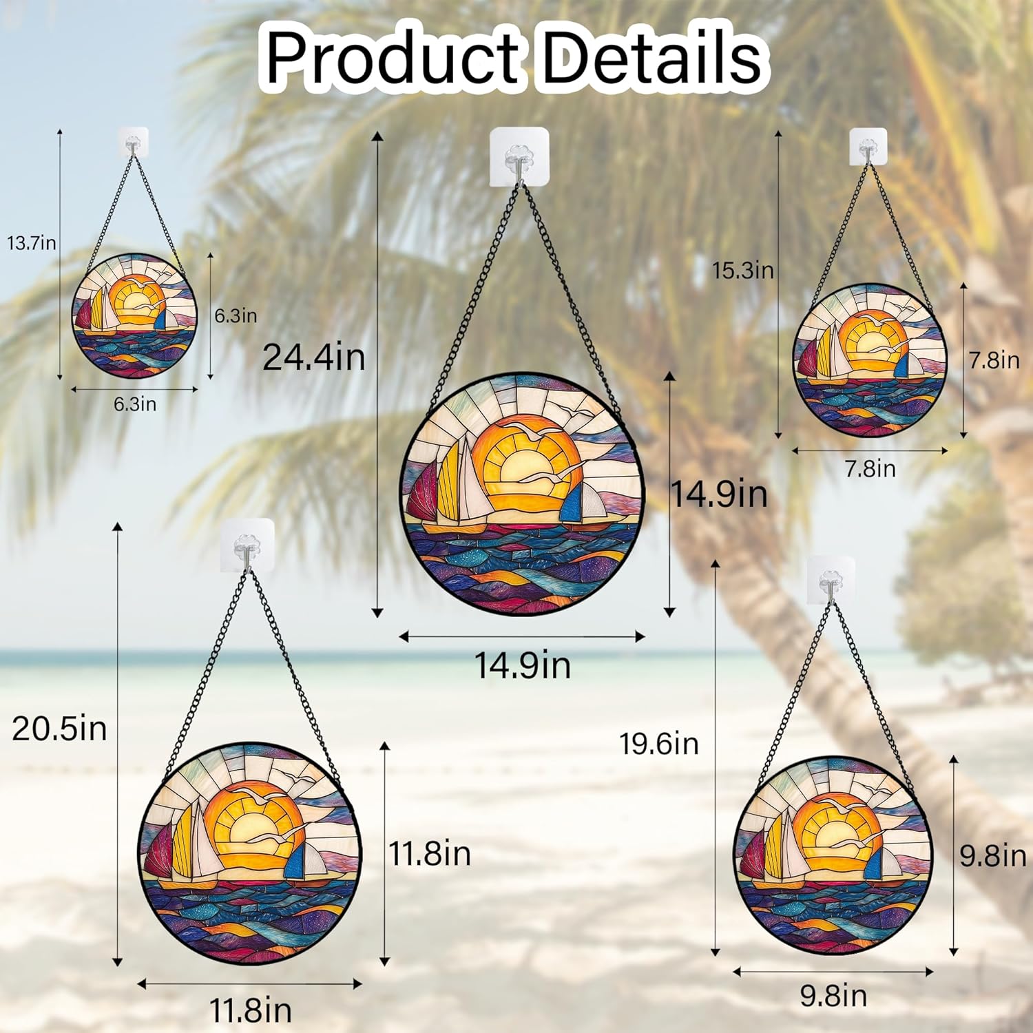 Stained Glass Window Hanging, Sailboat and Waves Suncatcher Diamond Glass Panel Hangings Sun Catchers Decor for Birthday for Women, Men, Wife, Aunt, and Mom 14.9x14.9 in