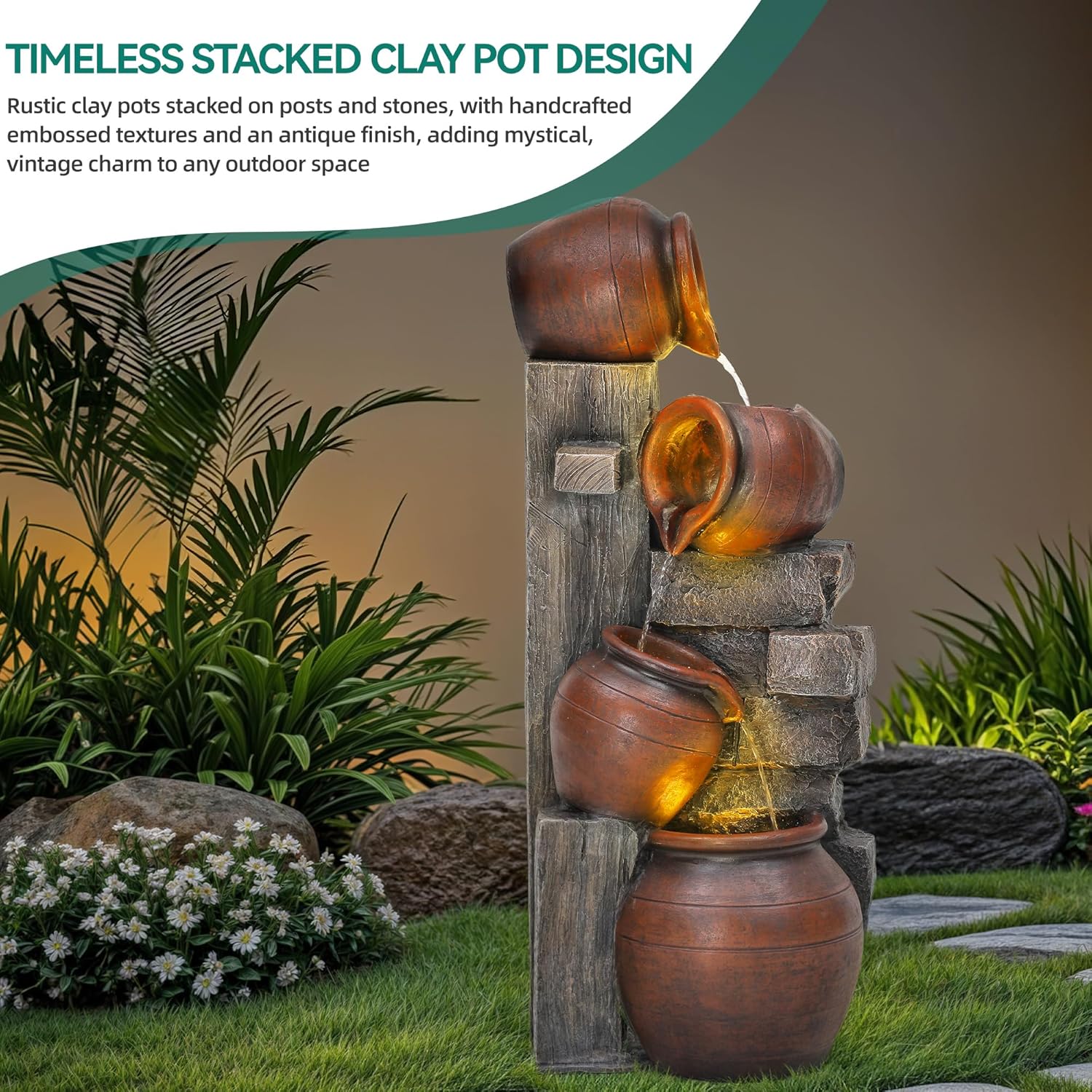 • TIMELESS STACKED CLAY POT DESIGN: Our outdoor resin fountain features rustic clay pots stacked on posts and stones. With handcrafted embossed textures and an antique finish, it adds a mystical, vintage charm to any outdoor space. Measuring 13.78"L X 12.99"W X 31.5"H, a wonderful focal point for any garden, patio, or outdoor living space.