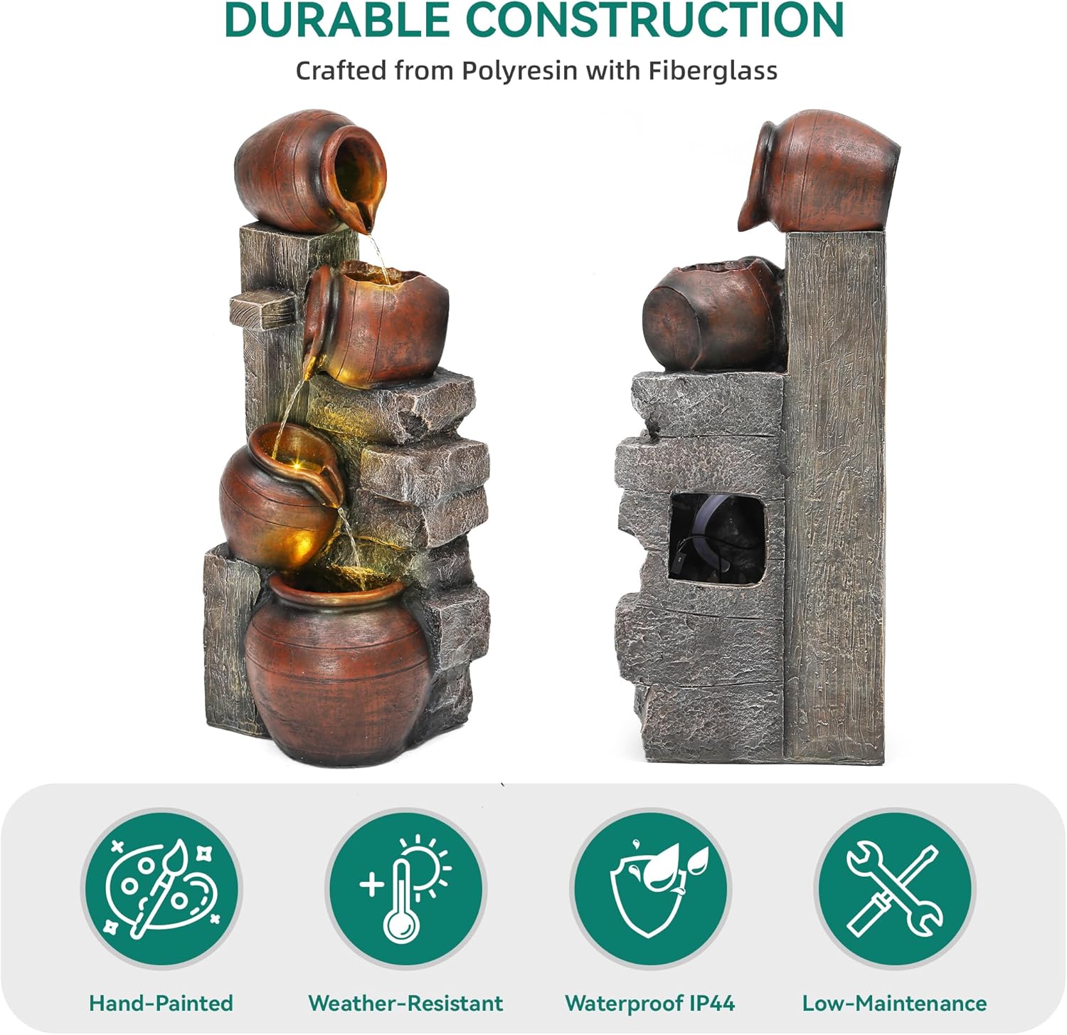• SOOTHING CASCADING WATER: The intriguing cascading water of this outdoor water fountain transforms your outdoor space into a soothing oasis. Whether you're seeking a moment of deep meditation, a relaxing retreat, or a place to unwind after a long day, this fountain is the delightful addition to your patio, turning it into a haven of tranquility.