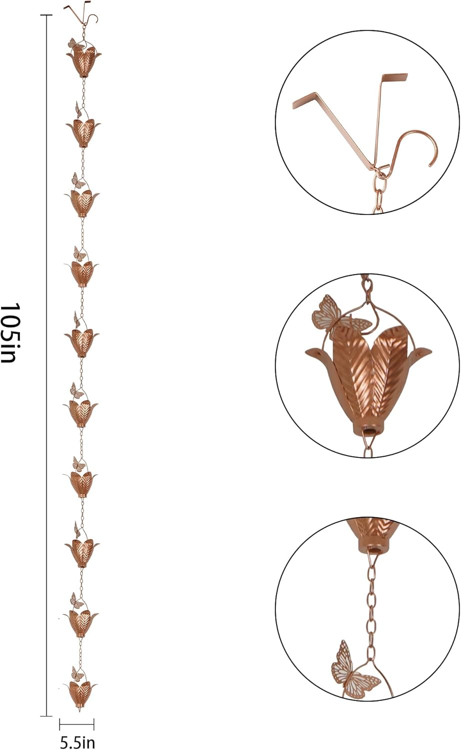 • 【Elegant Alternatives】 The rain chain is composed of 10 Flower Cups with Butterfly cups and is sized to fit standard single-story buildings. The unique design adds a chic touch to roofs and awning nests. It is an elegant alternative to traditional gutter downspouts