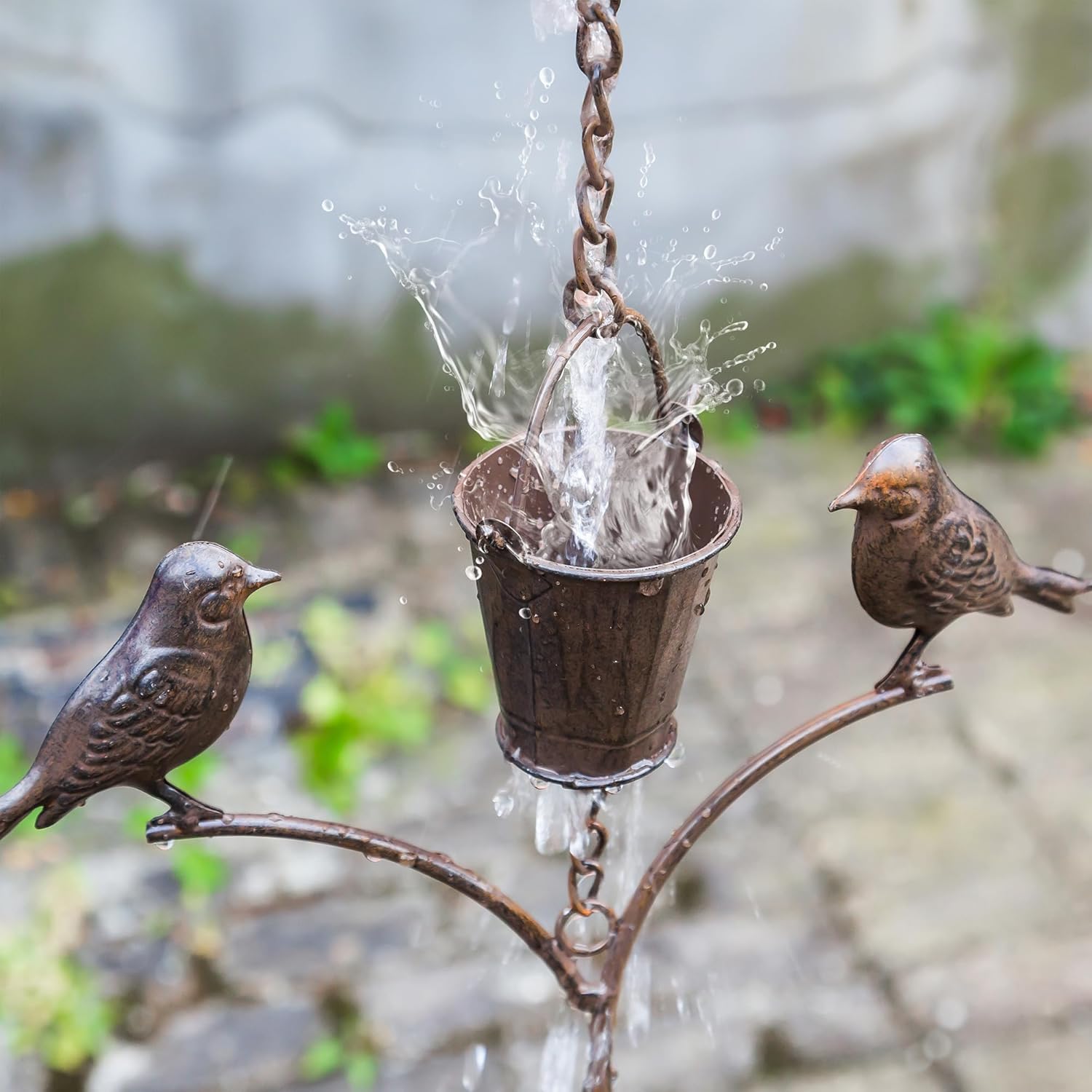 • 【Beautiful design】Overall antique design, each pair of birds guards a bucket from head to tail, very beautiful and decent shape, the bottom of the thick bell makes the rain chain will not easily shake, keep the shape, and also make a melodious ringing sound when shaking. Beautiful rain chains hang from gardens, porches, gazebos, travel trailers, and front doors, and your friends will appreciate and praise the arrangement