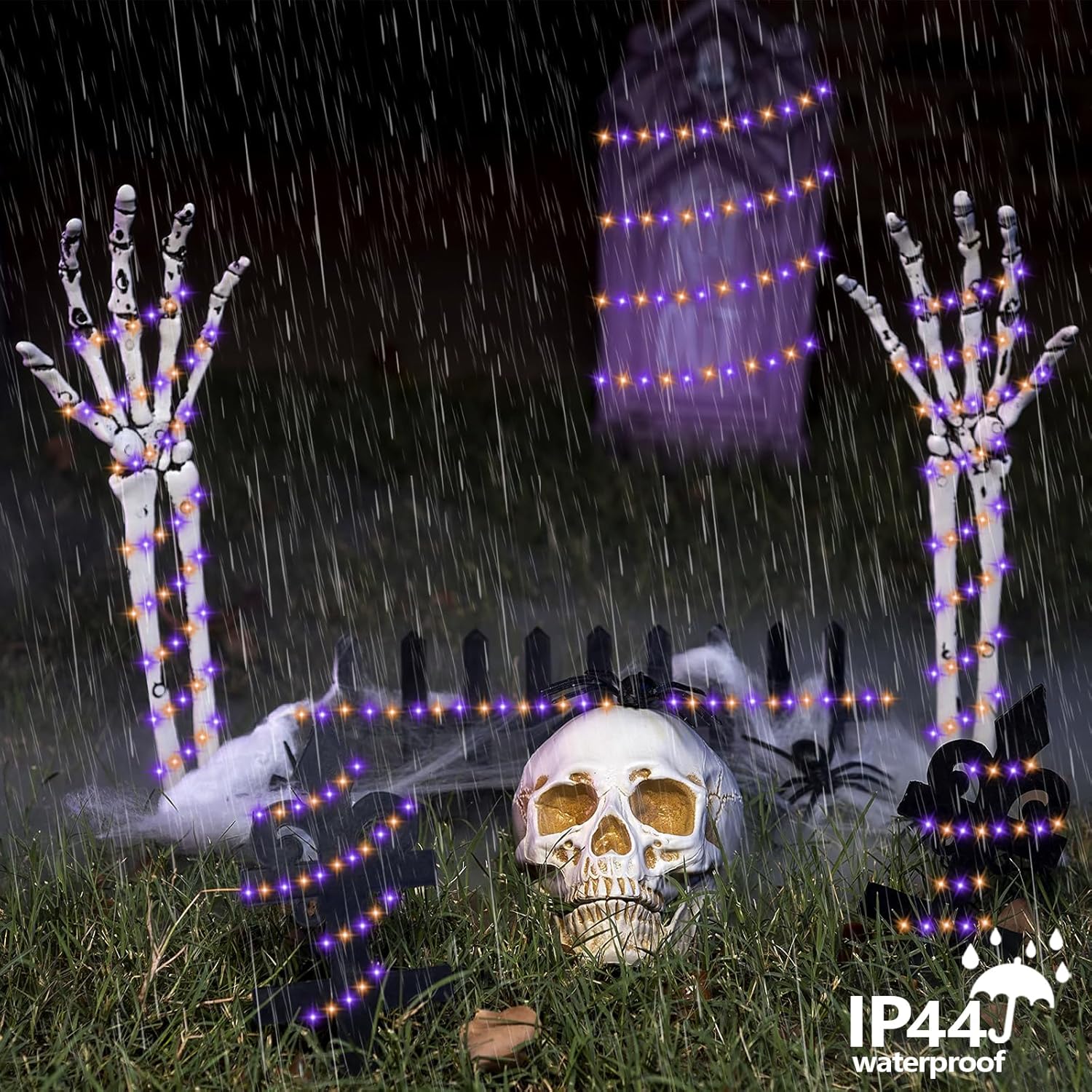 • IP44 Waterproof: The copper wires and solar panels of the orange and purple halloween lights are all waterproof. They can function properly even in the case of heavy rain or heavy snow, creating a perfect Halloween atmosphere
