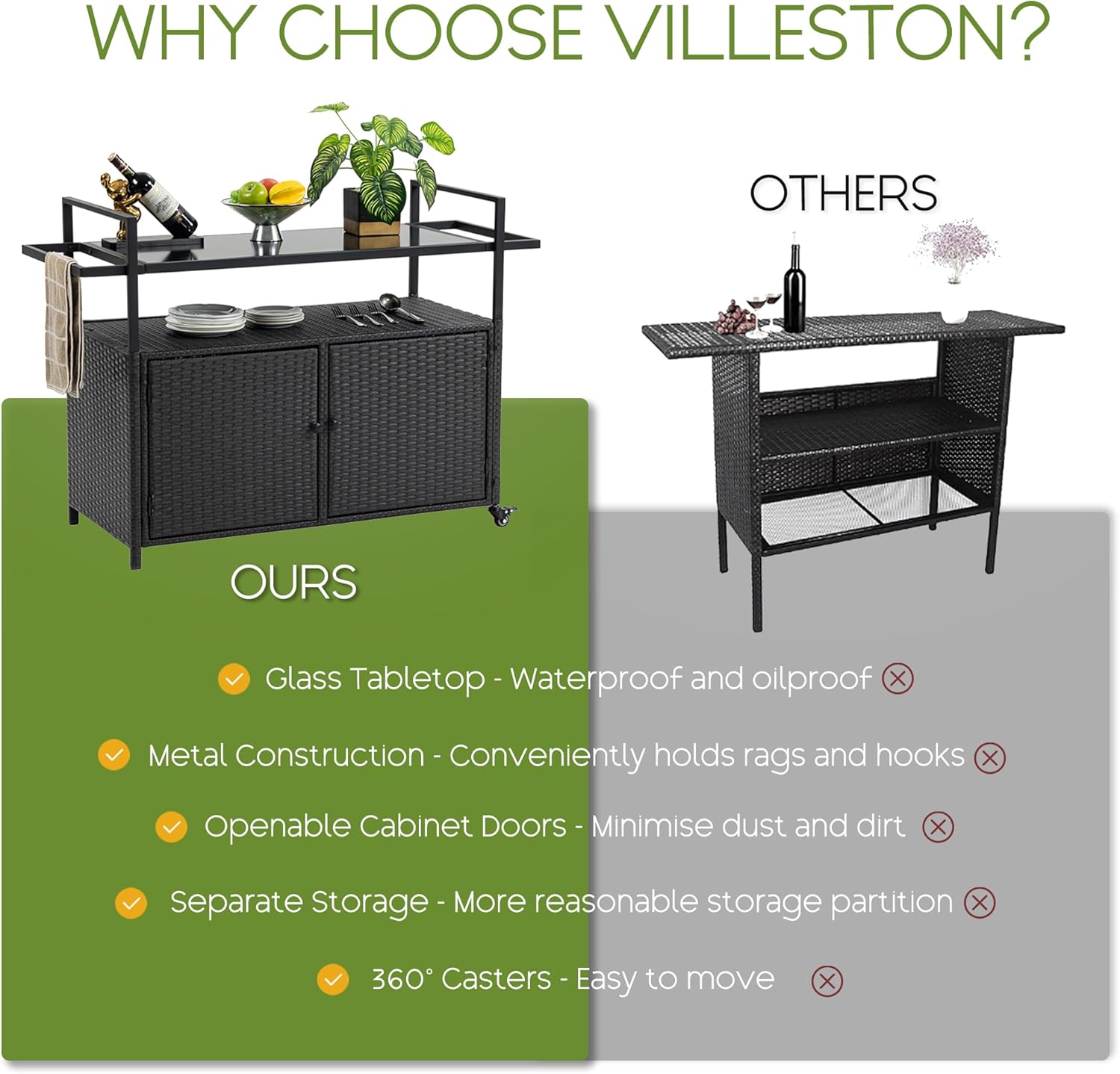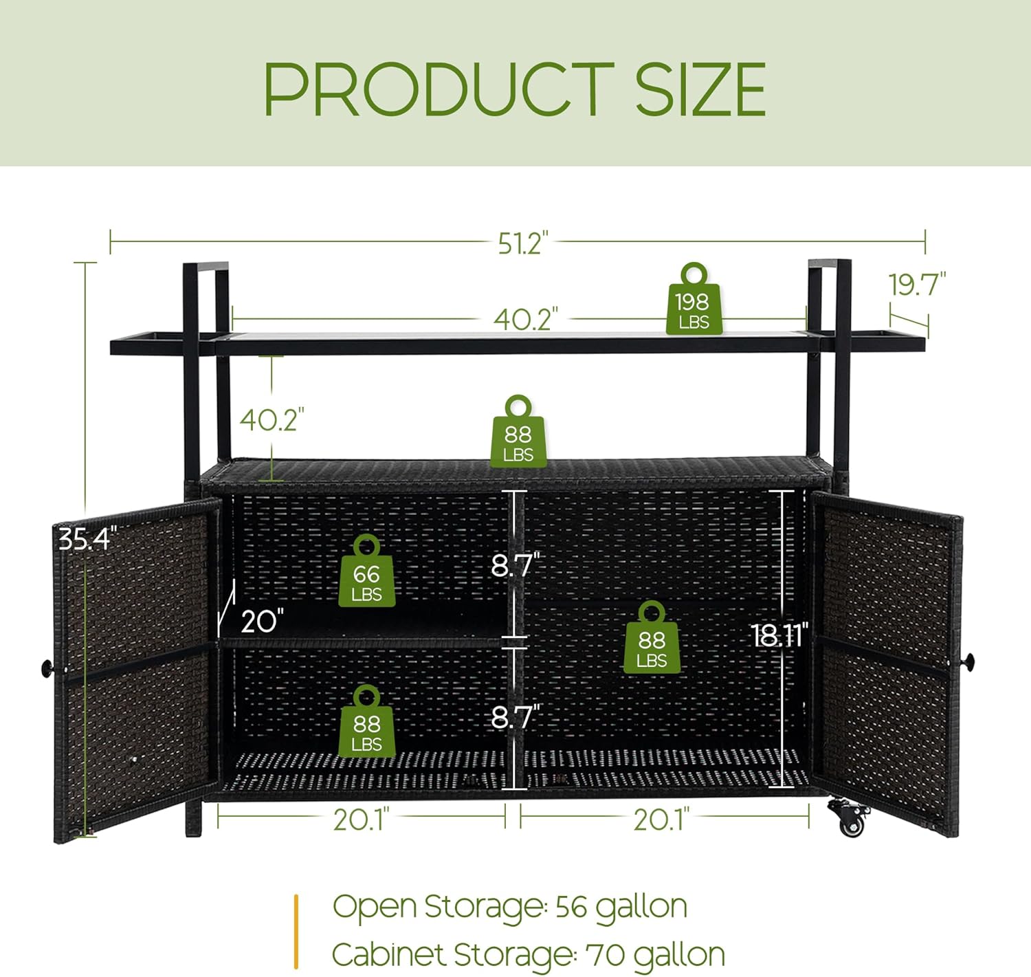 • ALL-SEASON USE: Crafted with UV-resistant and waterproof wicker, this patio bar cart withstands sun exposure, rain, and changing weather conditions. Whether used as an outdoor storage cabinet, a bar station, ensuring both stability and durability