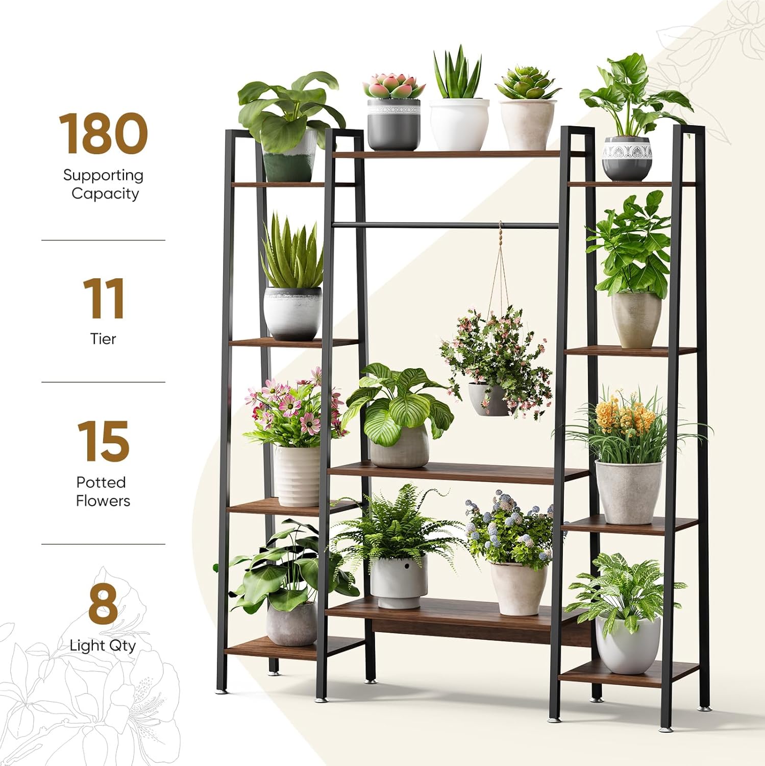 • 【Expandable 12-Tier + Hidden Storage】12 adjustable shelves (20% more than 6-tier stands) hold 30+ plants. Removable tier converts to tool storage or display space for books/art. Matte walnut finish resists water stains.