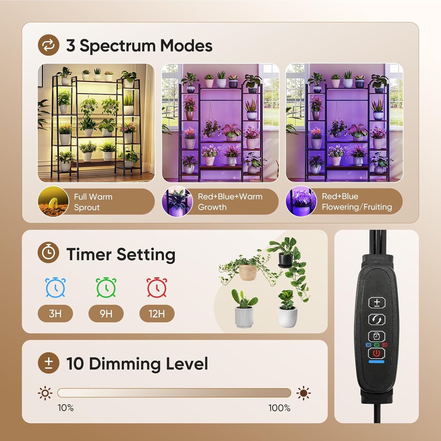 • 【Smart Auto Timer & 10-Level Dimming】Program daily cycles (3/9/12H) with one-touch memory function. Adjust from soft 10% glow for succulents to 100% intensity for hydroponics—each shelf’s 3 extra LED strips prevent shadow zones.
