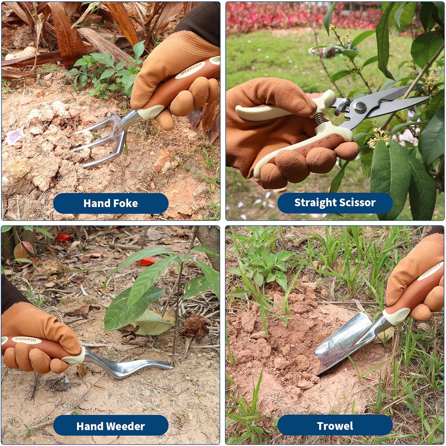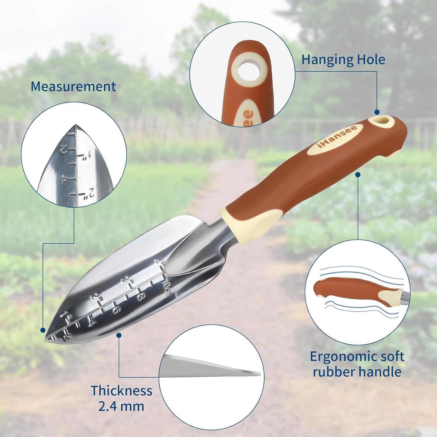 • Durable and Rust-Resistant Garden Tools: Crafted from aluminum alloy, iHansee gardening tools are lightweight yet strong, offering long-lasting durability and rust resistance. Each tool has an ergonomic concave-convex handle made of PP+TPR for a comfortable grip. Designed to reduce strain on wrists and hands, the handles provide excellent leverage for digging, planting, and weeding.