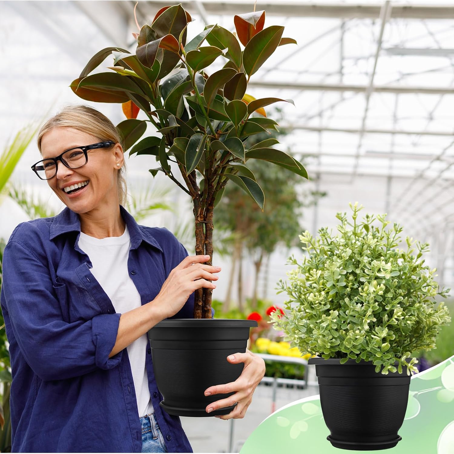 12 Pack 10'' Plastic Plant Pots Round Planter Pots with Saucer Tray Seedling Pot Hole Seed Resin Plant Pot Starting Nursery Flower Container with Pallet for Garden Outdoor Indoor(Black)