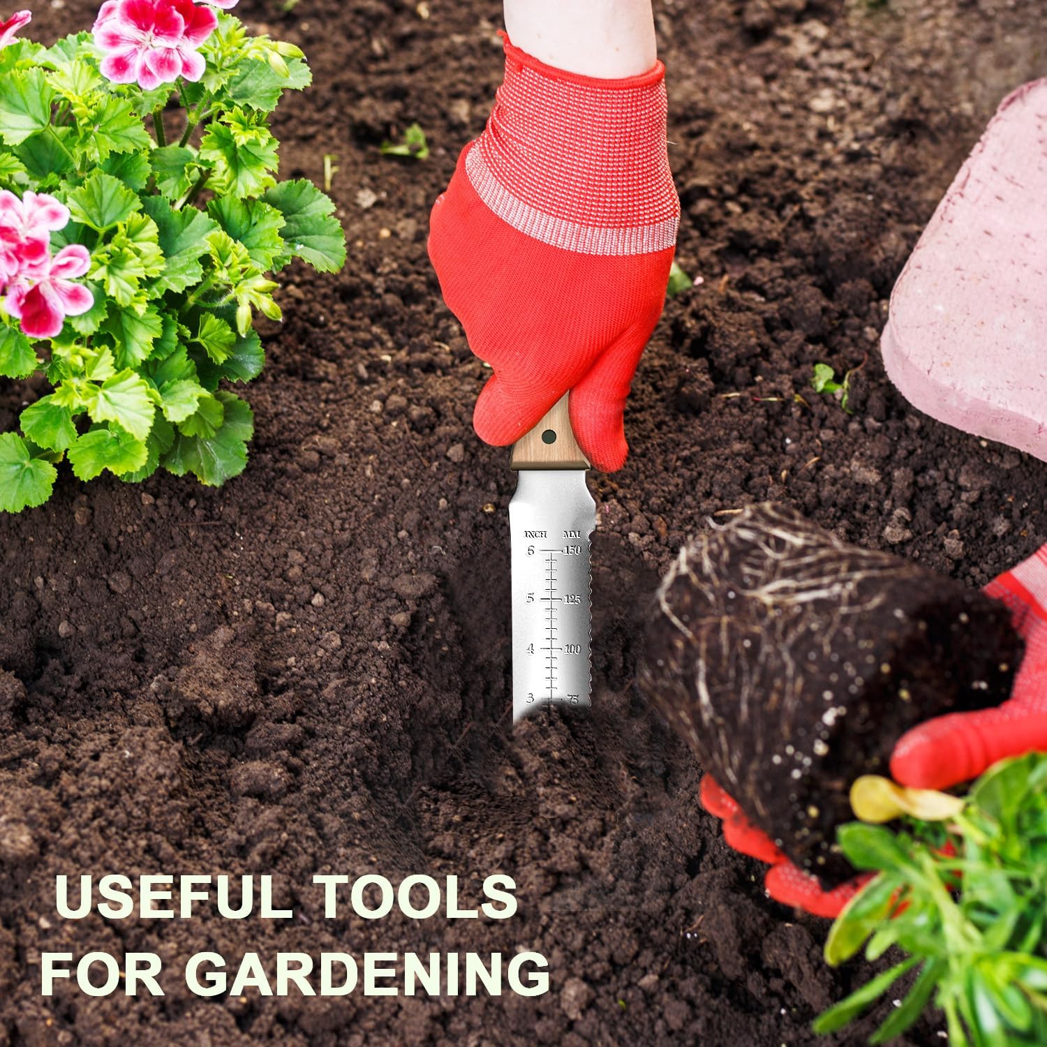 • Precision Depth Markings & Serrated Edge Plant bulbs and seedlings perfectly every time! Clear inch markings on the blade take the guesswork out of planting depth. The sharp serrated edge on one side effortlessly cuts through tough roots, twine, bags, and sod, adding another layer of utility to this garden spade alternative.