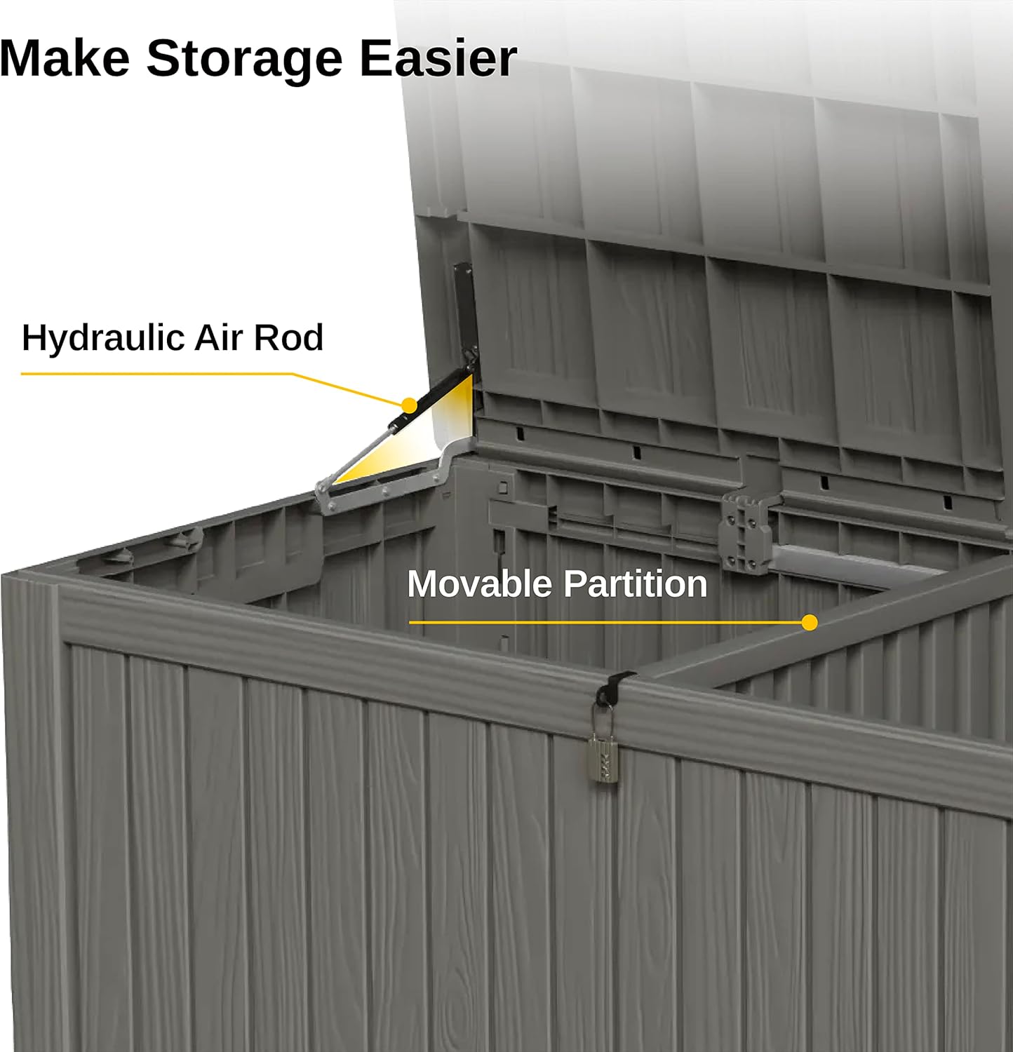 • π—¦π—”π—™π—˜ 𝗔𝗑𝗗 π—¨π—¦π—˜π—₯-𝗙π—₯π—œπ—˜π—‘π——π—Ÿπ—¬ π——π—˜π—¦π—œπ—šπ—‘: Featuring a hydraulic lever mechanism, this outdoor storage box ensures smooth and safe operation, eliminating the risk of hand injuries. Inside, a detachable partition allows for organized, sectioned storage of your items.