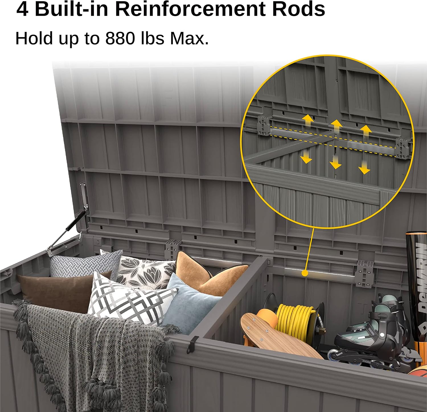 • 𝗗𝗨π—₯π—”π—•π—Ÿπ—˜ 𝗔𝗑𝗗 π—Ÿπ—’π—‘π—š-π—Ÿπ—”π—¦π—§π—œπ—‘π—š: Crafted from weather-resistant resin, this deck box resists rust, peeling, and denting, offering greater longevity than wooden alternatives. Equipped with 4 built-in reinforcing rods, it maintains its shape even after prolonged sun exposure.