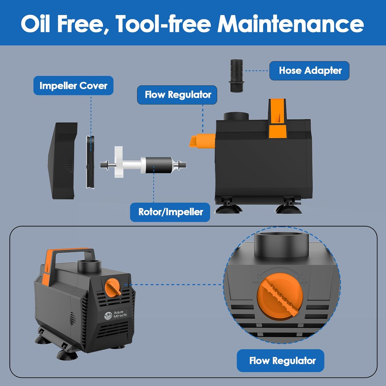 • CONVENIENT MAINTENANCE - Designed with a handle for portability, this fountain pump is user-friendly. Maintenance is hassle-free with no lubrication required and no special tools needed. Simply detach the front screen, rinse the components, and reassemble.