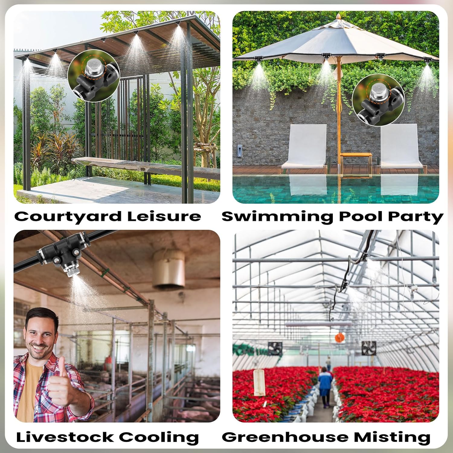 • 【Ideal for Multiple Uses】Designed for outdoor misting cooling system.Perfect for cooling off during hot summer days, whether you're lounging by the pool, enjoying time with your pets, or simply relaxing in your backyard