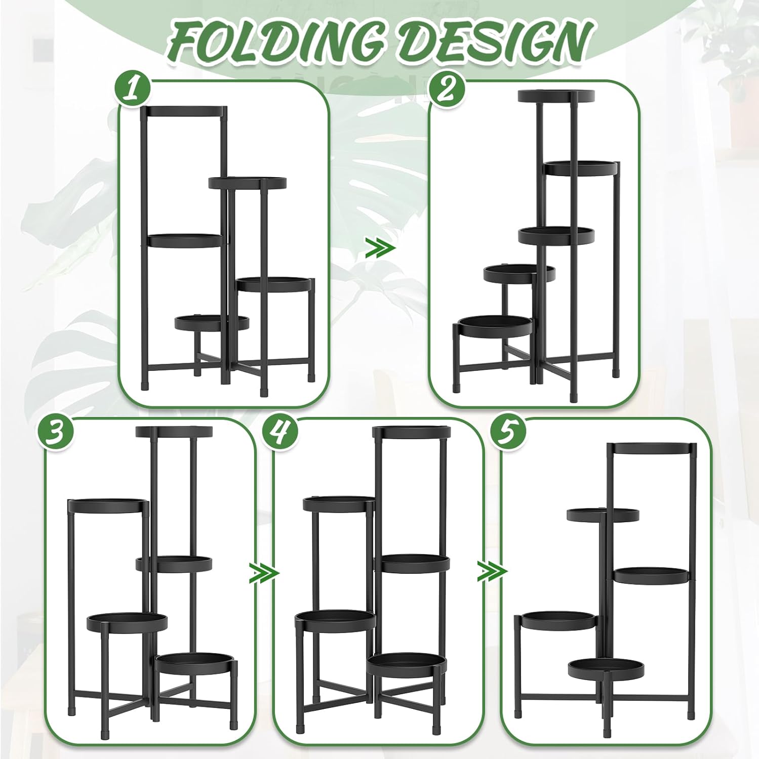 iDavosic.ly Plant Stand with Garden Tools, 5 Tier Corner Metal Flower Display Holder Shelf Indoor Outdoor, Folding Tall Orchid Rack for Patio Balcony Porch Living Room House, Black