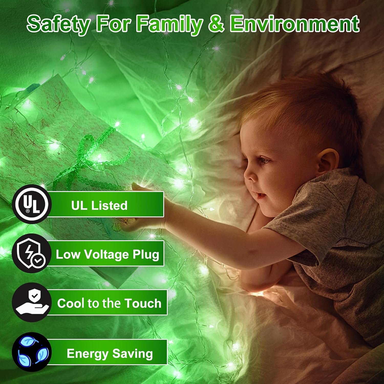 • Safe, Family-Friendly & Energy-Saving: UL-certified plug and low-voltage LED string lights keep them cool to the touch, safe for kids, pets, and delicate indoor décor—even after hours of use. Consuming far less power than traditional bulbs, these energy-saving holiday lights shine bright without raising your bill. Perfect for family-friendly homes, they deliver more sparkle with less worry, making them the reliable choice for both indoor Christmas lights and outdoor setups