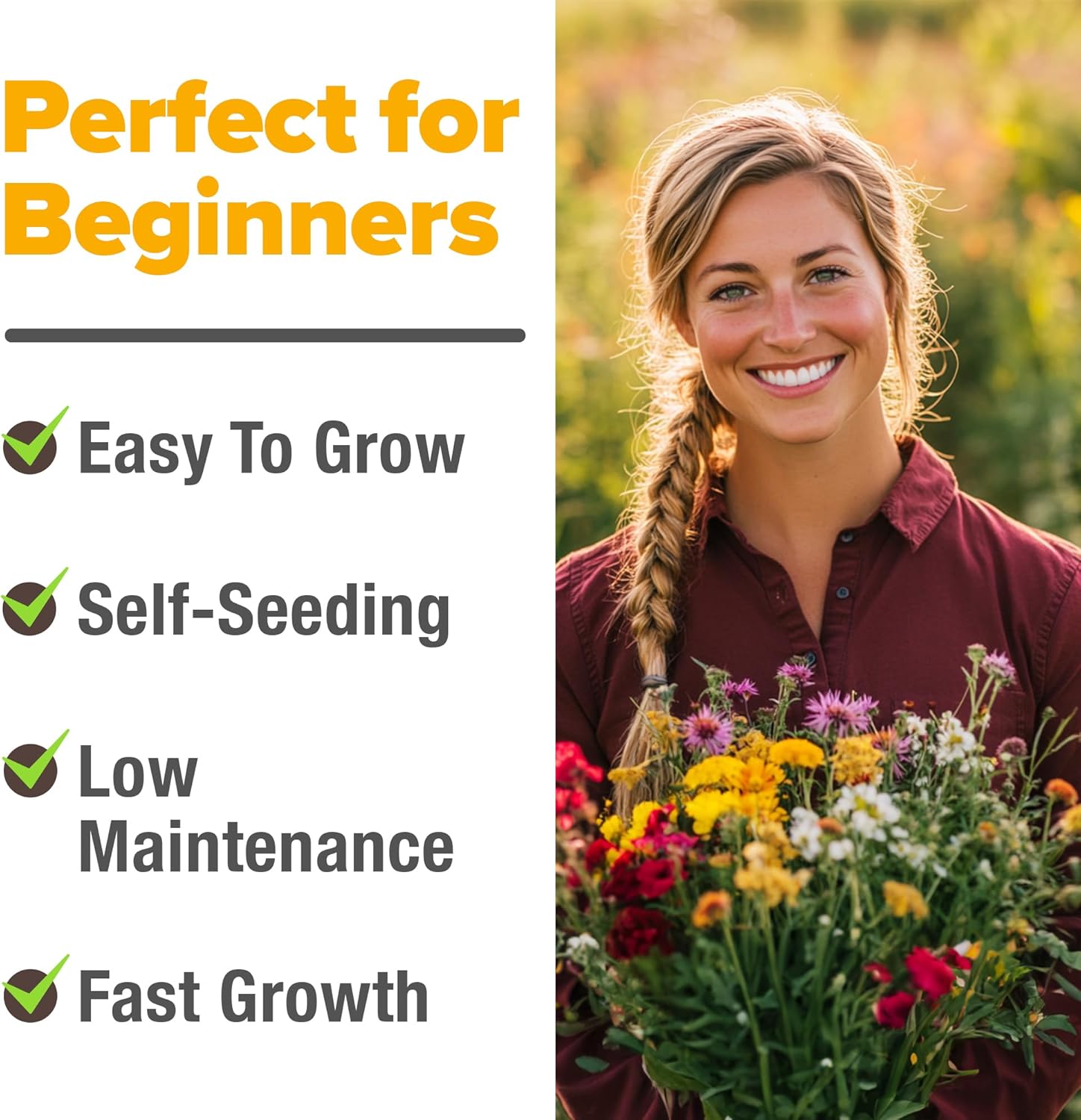 • ALL-SEASON COLOR DISPLAY: Mixture of perennial wildflower seeds and annuals for continuous blooming; Includes favorites like California Poppy, Purple Coneflower, and Cosmos; Creates a natural, meadow-like appearance with varied heights and textures