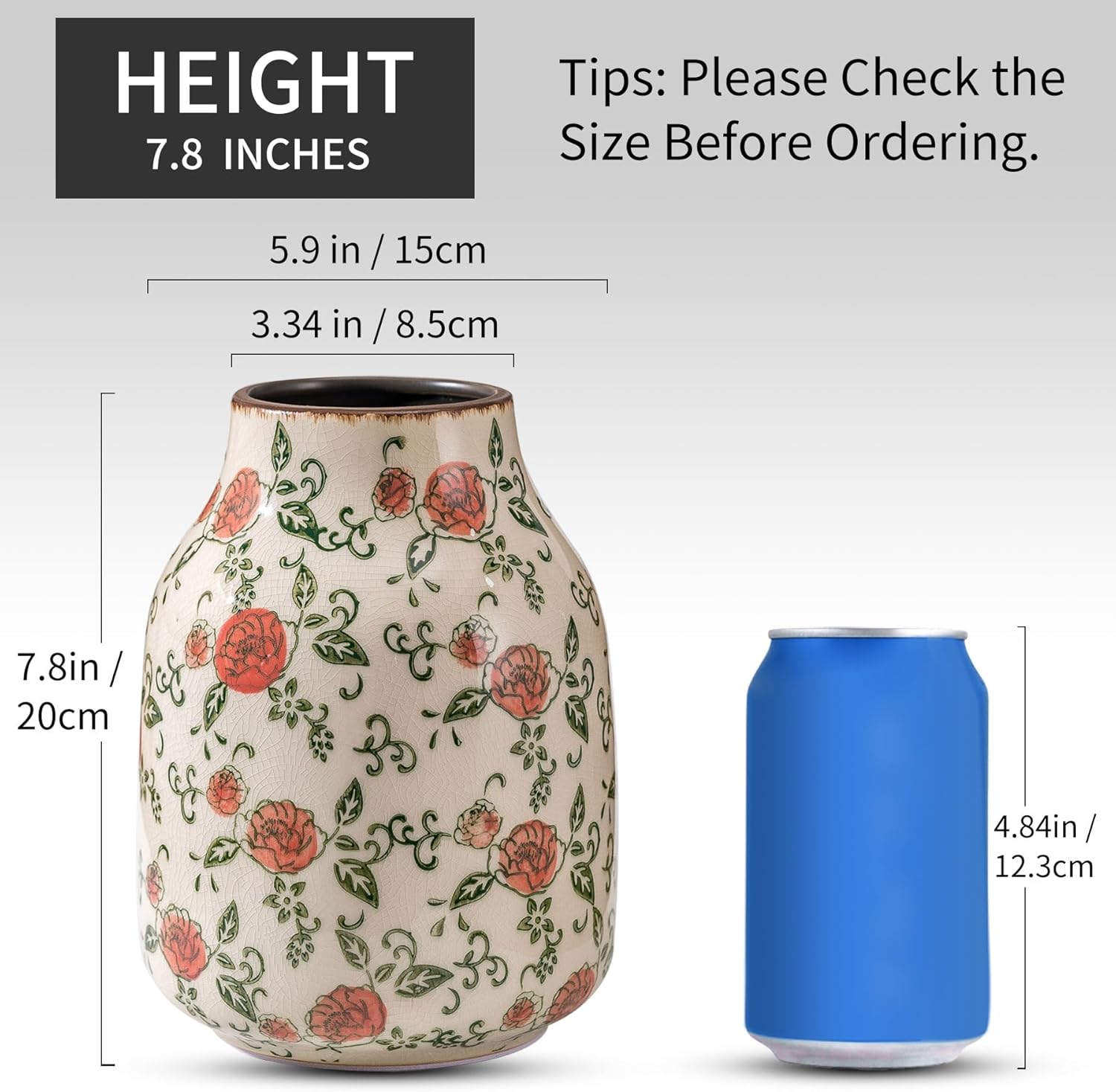 Green and Beige Vintage Round Vase, Red Rose Chinoiserie Floral Vase, Farmhouse Antique Decorative Ceramic Flower Vases for Bouquet, Home Decor, Living Room, Bookshelf, Office, Tuscan Decor 7.8 Inch